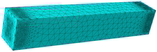 Except for the solid concrete in treatment 1 treated with first-order hexahedral mesh division, the solid concrete in the other treatments is divided with second-order tetrahedral mesh division, with a global mesh size set to 200 mm. The curvature capture is set to 30 degrees/360 degrees to densify the position of curvature changes; the steel bars in this structure are subjected to compression, and the steel bars are made of T3D2 truss elements with a size of 200 mm. The beam sleeve is made of shell elements with a global mesh size of 50 mm, and the curvature capture is set the same as that of concrete. The mesh division model for treatment 2–18 is shown in Figure 8 and Figure 9.