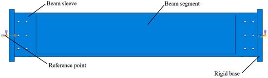 The rectangular concrete of the beam segment is simulated with solid units using isotropic assumptions (Figure 6). The main role of steel reinforcement in RC structures is to carry tensile forces. At the same time, relative slip occurs between the tension bars and stirrups and the concrete. In axial compression analysis, the sliding effect between concrete and reinforcement has a negligible impact on the compressive bearing capacity. Therefore, the reinforcement and stirrups are modeled using truss elements (Figure 7). As the thickness of the beam sleeve steel plate is less than one-tenth of the dimensions in other directions of the beam sleeve, the beam sleeve is simulated as the shell unit. Neglecting relative slip between the concrete and the beam sleeve, the Tie connection is used to simulate the connection behavior between the steel plates of the beam sleeve and the concrete.