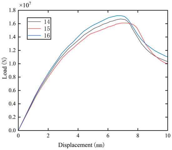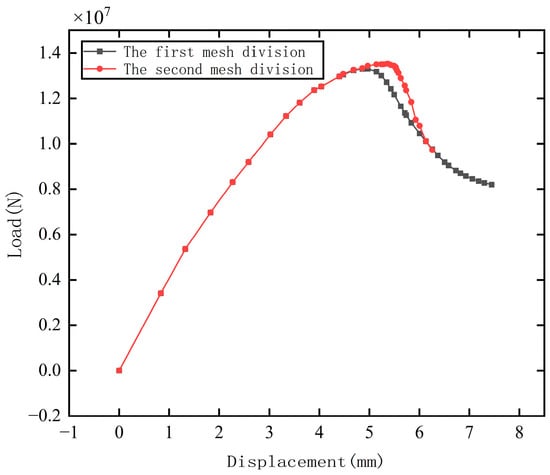 Select the finite element analysis results of treatment 1, treatment 3, and treatment 14 at different mesh sizes or shapes to verify the independence of mesh shape and mesh size from the analysis results. The peak bearing capacity of the three treatments under different mesh sizes or mesh shapes is shown in Table 5. Through comparison, it was found that mesh size and mesh shape had little effect on the peak axial bearing capacity of the specimen. The reason for this is that mesh division is based on continuous media, and the calculation of bearing capacity is based on secondary processing of node displacement. However, displacement capture accuracy is not sensitive to mesh density and shape, and peak bearing capacity fluctuates very little under different mesh shapes and sizes. The stress contour maps of the specimen under two different mesh divisions are shown in Figure 13. The axial compression load-displacement curves of the specimens under two mesh divisions are shown in Figure 14. It can be seen that the curves of the specimens with two mesh divisions are basically overlapped except for some differences in the maximum value (The peak load-bearing capacity of the first mesh is 13,300 kN, while that of the second mesh is 13,530 kN, differing by only 1.7%), and the failure location of the specimen is basically in the same area. This further indicates that the mesh division of the specimens has little effect on the finite element analysis results.