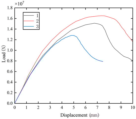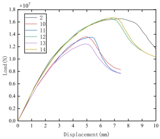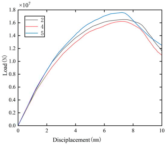 The boundary of the specimen in Treatment 1–5 is set as a rigid surface (represented by ‘-’ in Table 4). The pressure displacement curve of the beam section is shown in Figure 15, in which the number next to the legend represents the treatment number (the same in the following figures). As shown in Figure 15, the maximum bearing capacity of the specimen with a beam sleeve and a connecting hole (treatment 2) is about 16,500 kN, while the maximum bearing capacity of the specimen without a beam sleeve and a connecting hole (treatment 3) is about 12,500 kN. This finding that opening holes in reinforced concrete members reduce their bearing capacity is consistent with the phenomenon described in the literature [,,,,]; additionally, the law that the beam sleeve can significantly improve the bearing capacity of the specimen is consistent with the research findings in the literature [,,,,]. The curve trend of the specimen without a beam sleeve and connection hole (treatment 1) is similar to that of treatment 2. The maximum bearing capacity of treatment 1 is 15,000 kN, which is 1500 kN (about 6.3%) lower than that of treatment 2, but 2500 kN higher than that of treatment 3.