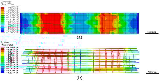 Treatment 1 simulation results. (a) final damage contour map of concrete of treatment 1, (b) final stress contour map of reinforcement skeleton of treatment 1.