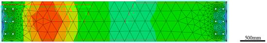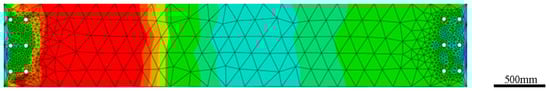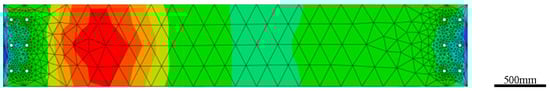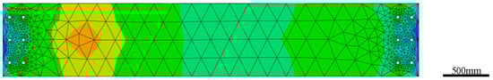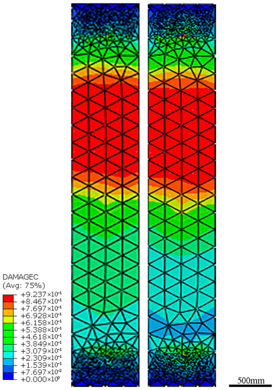 The specimen with a certain thickness of beam sleeve and a certain hole diameter only changes the position of the concrete compression damage section under different beam-end friction constraints, which has little effect on the bearing capacity displacement curve of the specimen (because the difference of the bearing capacity displacement curve between specimens is very small, some treatments are not listed in Table 4). The friction coefficient in treatment 6 is zero, and the damage contour map of the concrete in the treatment 6 specimen at a certain time in the linear loading section (just after the maximum bearing capacity) is shown in Figure 19 (Legends in Figure 20, Figure 21, Figure 22 and Figure 23 are the same). It is clear that when the lateral constraint at the end is zero, the “confinement effect” at the end is zero, and the bearing capacity of the end section in the specimen is significantly reduced. The failure section caused by the plastic compression damage of the concrete will occur at the hole section. This is consistent with the dangerous section position obtained by using the results of material mechanics analysis.