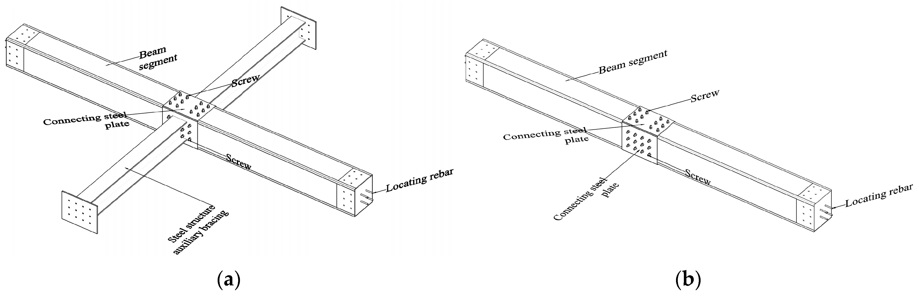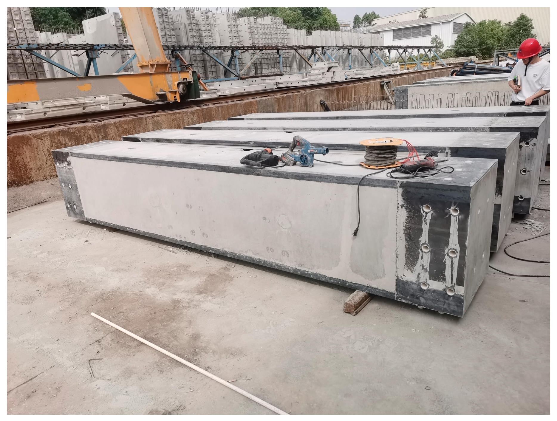 - Ye, J.J.; Wu, T.L.; Xu, K.J.; Liu, B.; Zhang, X.H.; Gao, P.; Wei, S.S.; Zhang, J.M.; Tan, B.H.; Xu, G.H. Prefabricated Reinforced Concrete Beam Segment for Foundation Pit Bracing and Its Pre-Fabrication Method. CN119711508A, 28 March 2025. [Google Scholar]