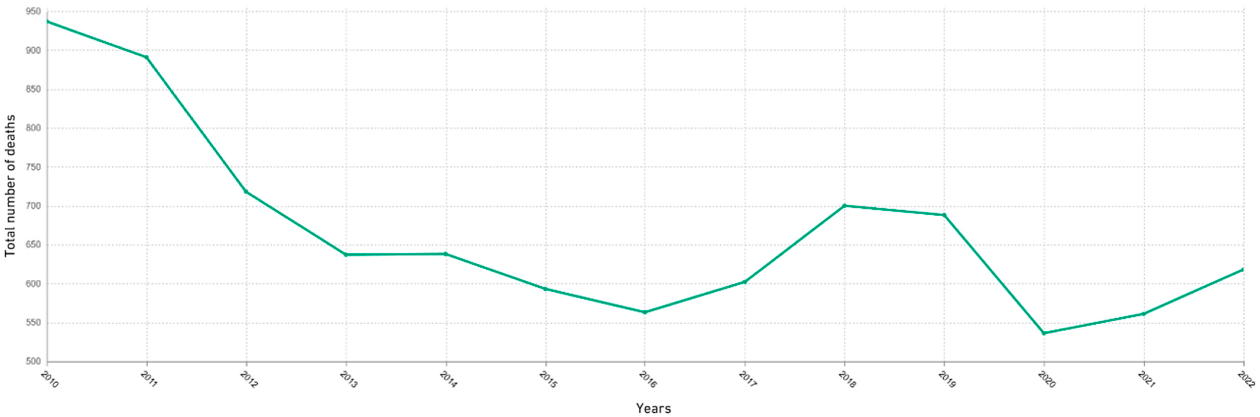 Figure 1. Number of deaths per year related to road accidents in Portugal [3].