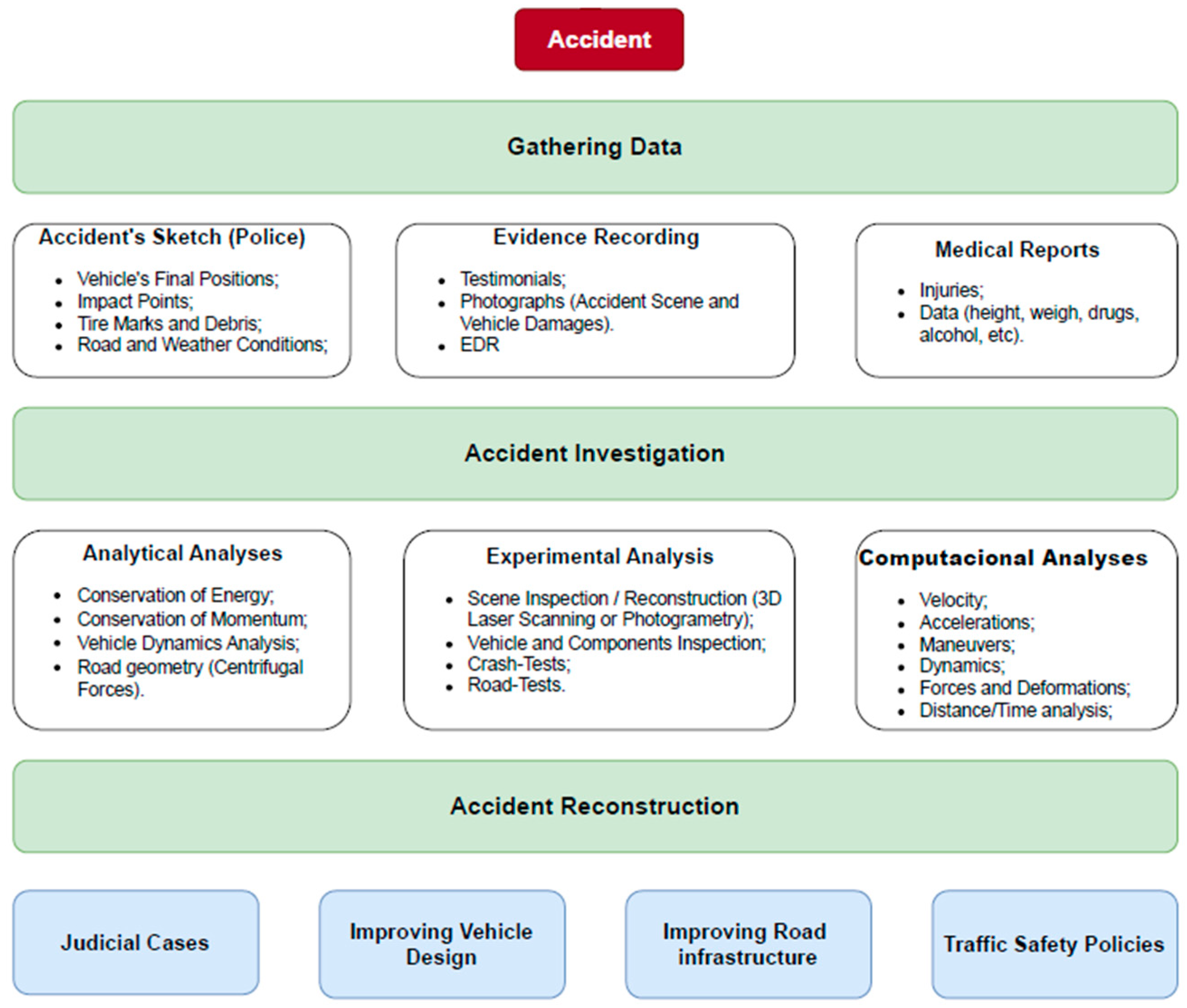 Forensic engineering for the investigation of a road accident event involves a combination of various techniques and technologies to gather evidence, with the main purpose of reconstructing the events leading up to the accident. This way, it is possible to determine its main causes and propose strategies and tools (such as laws or regulations) to prevent future occurrences. The main steps to investigate an accident include data collection to perform scene mapping and reconstruction, vehicle and component analysis, evaluation of human factors, and dynamic simulation and modeling. Recent advances used to reconstruct road accidents and perform other useful tasks regarding road accident investigation include 3D laser scanning and image processing analysis (enabling the accurate documentation and reconstruction of the crash scene), computer-aided design (CAD) programs, vehicle specification databases, momentum and energy analysis, collision simulation programs, and photogrammetry software. Moreover, video cameras and vehicle dash camera devices also play an important role in the reconstruction process of a collision. The methodology presented above is summarized in Figure 6 [33,34].