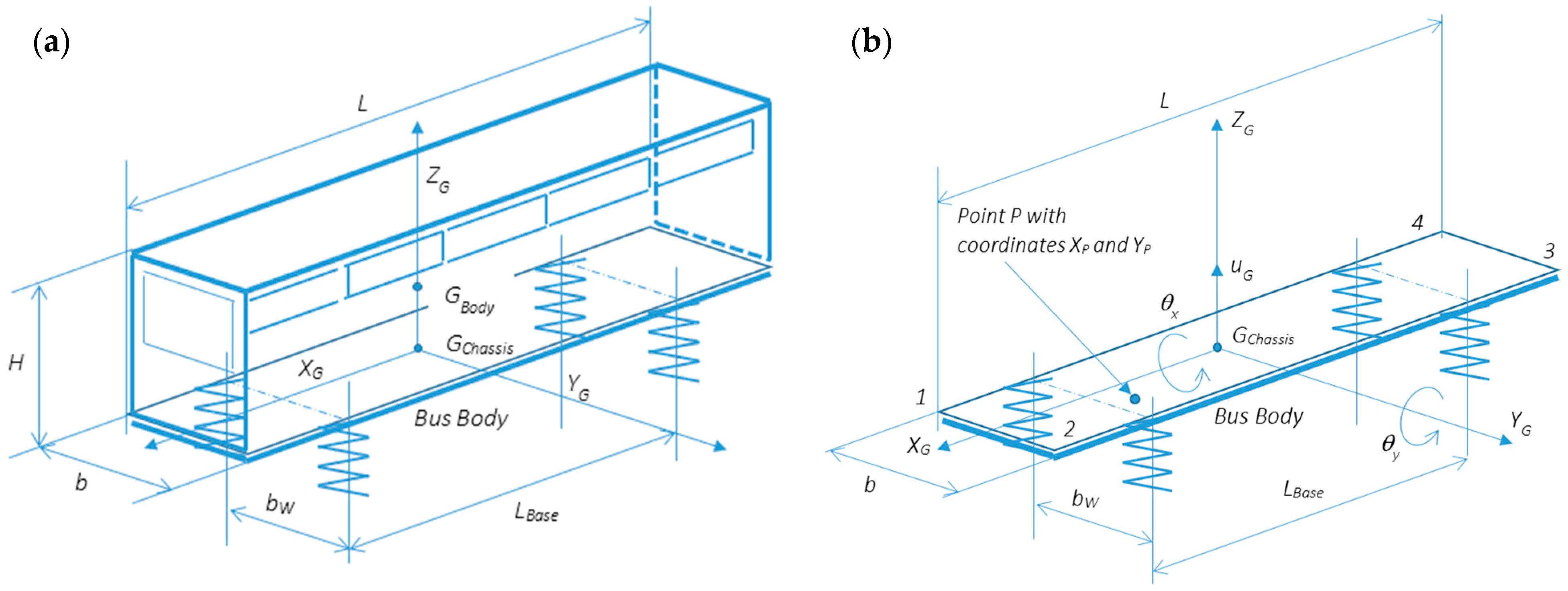 Figure 8. (a) Bus body dimensions and (b) equivalent chassis dynamic model with suspension (adapted from [35]). Legend: L—overall length; b—body width; L b a s e —wheelbase; and b w —track width.