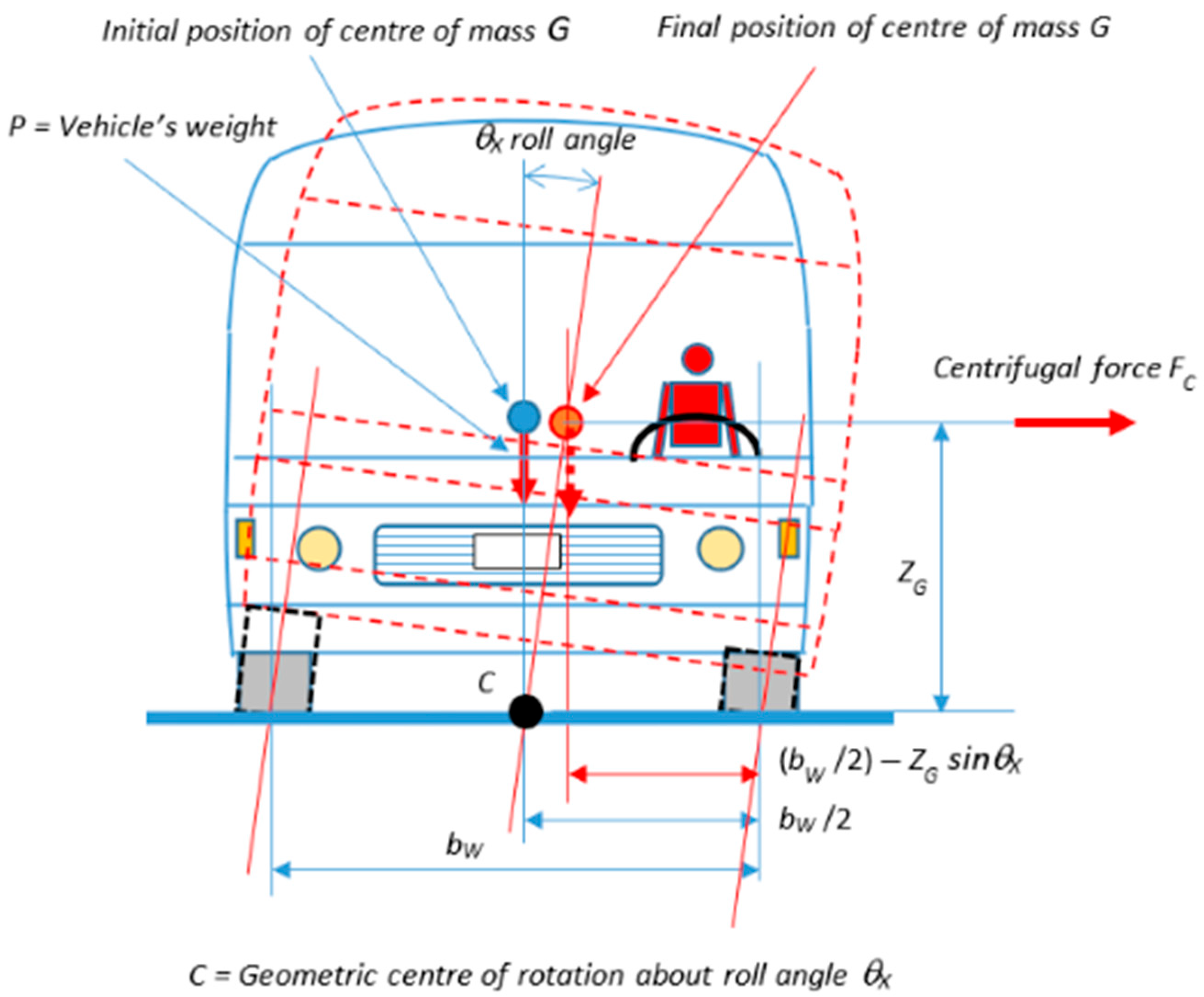An analytical method to investigate the factors that contribute to the overturning phenomenon in buses is presented, since a real-world accident involving this type of vehicle is presented in Section 3. By examining the relationship of several vehicle parameters, such as the CoG height, track width, and suspension properties, with external influences like lateral acceleration, we aim to establish a foundation for determining the critical conditions under which a rollover might occur.