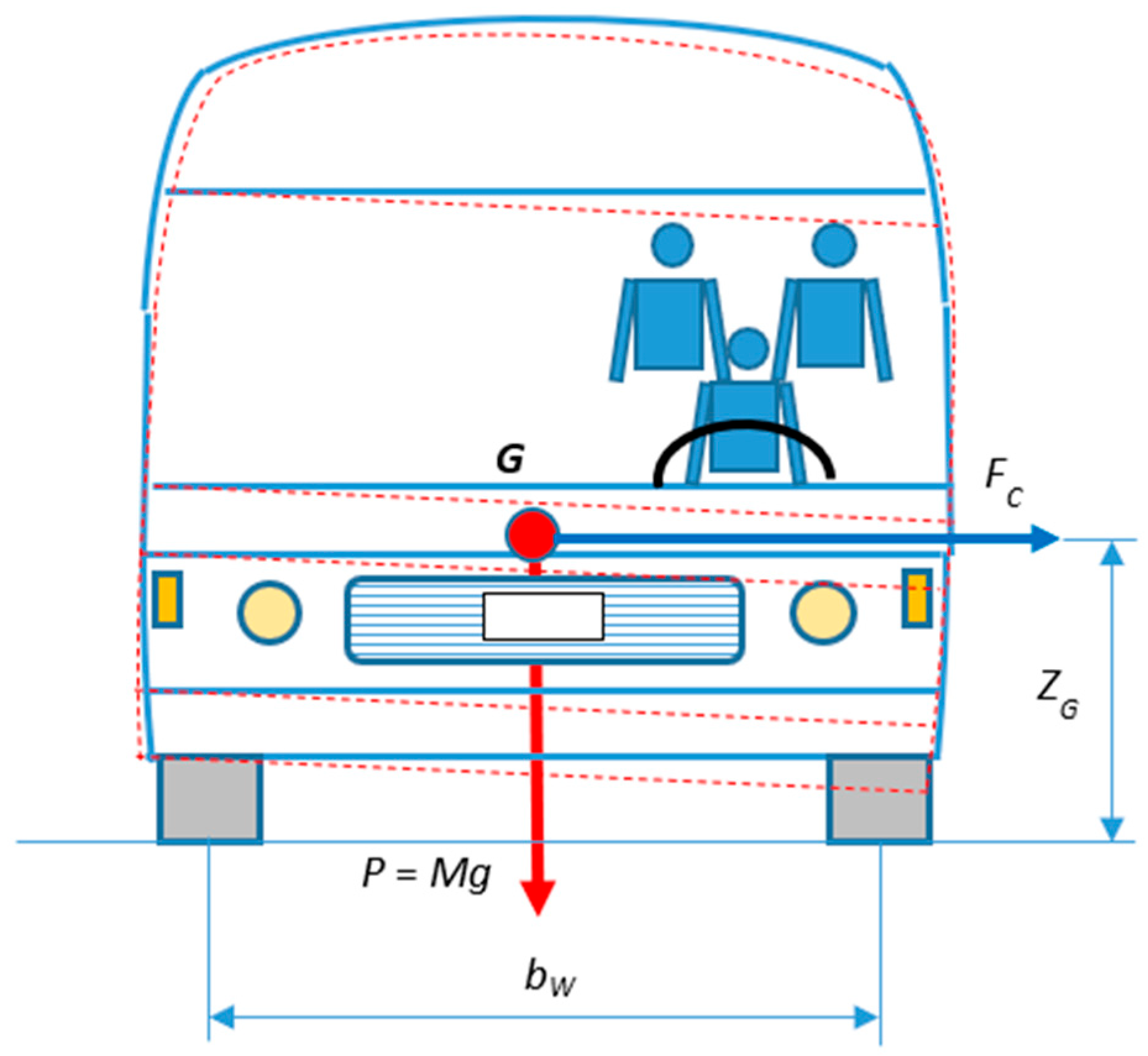 Figure 10. Front view of the vehicle with the passengers and driver: displacement (exaggerated). Legend: z G —vertical coordinate of the center of mass G; b w —vehicle track width; P —vehicle’s weight; and F c —centripetal force.