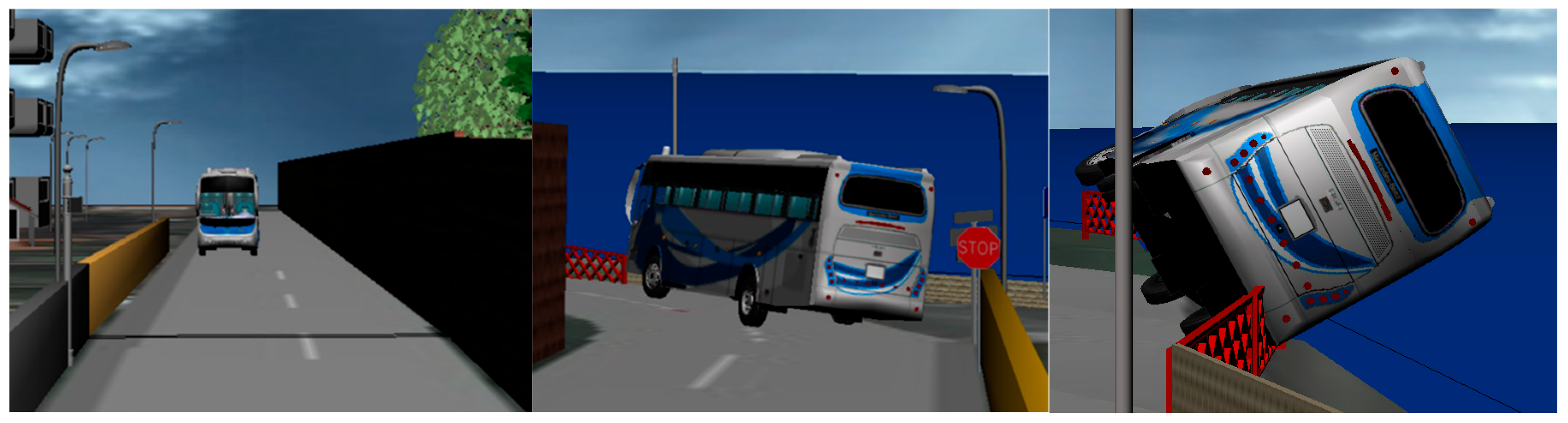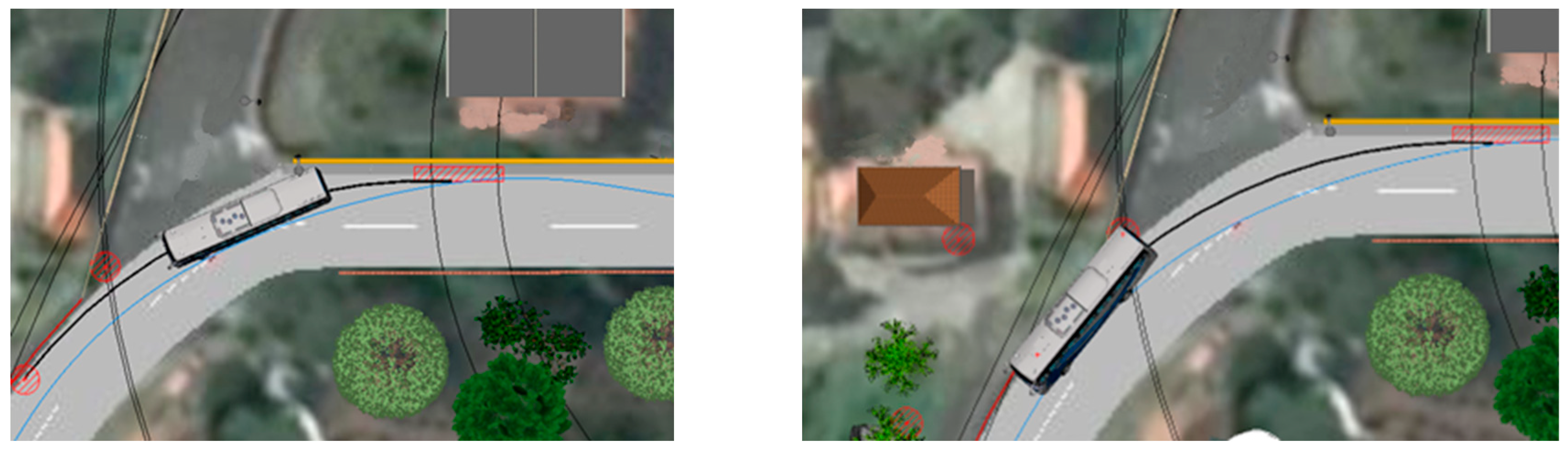 Taking the first recommendation to lower the vehicle’s center of mass, as an example, lowering the CoG to 1.5 m (instead of 1.582 m, that is, 82 mm lower) will increase the critical speed from 43.2 km/h to 44.5 km/h. It is important to mention that considering no passengers onboard ( m B u s = 13,300   k g ; u n l a d e n   v e h i c l e s   C o G   h e i g h t = 1.399 ) , the overturning velocity would increase to 46.9 km/h.