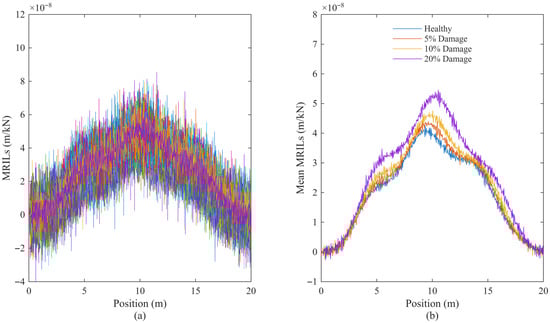 Calculated MRILs with 2% measurement noise for four bridge conditions: healthy, 5%, 10%, and 20% damaged. (a) MRILs from all 50 vehicles; (b) corresponding mean MRILs.