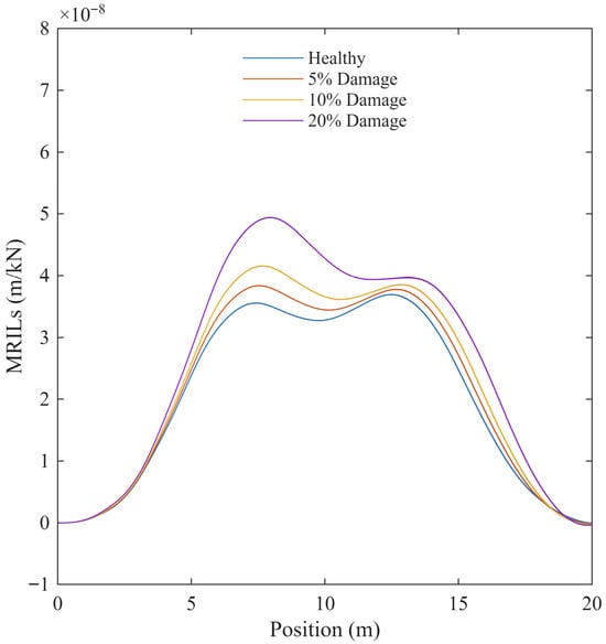 Calculated MRILs for four bridge conditions (healthy, 5%, 10%, and 20% damaged) at a vehicle speed of 10 km/h.
