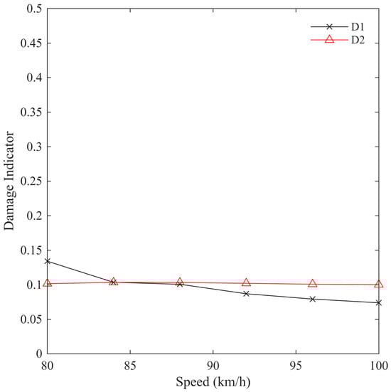 However, a distinct difference in stability is observed between the two indicators. The black curve (D1), which is based on the mid-span magnitude of the MRIL, shows greater variability with various speeds. This sensitivity arises because D1 depends on a single point in the MRIL curve, which is more affected by local fluctuations and dynamic vehicle–bridge interaction effects. In contrast, the red curve (D2), derived from the area under the MRIL curve, remains nearly constant across all tested speeds. Since D2 integrates the full MRIL curve, it averages out local variations and is therefore more robust against speed-induced dynamic effects.