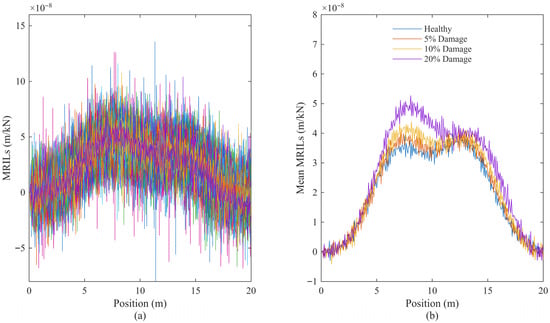 When the noise level increases to 5% (Figure 4), the individual MRILs in Figure 4a become more scattered, indicating a stronger noise influence on the raw acceleration data. Nevertheless, the mean MRILs in Figure 4b still exhibit characteristic patterns and relative differences among damage levels. Although higher noise introduces visible fluctuations, the average MRILs remain stable enough to distinguish between bridge conditions, demonstrating the method’s resilience to moderate measurement noise.