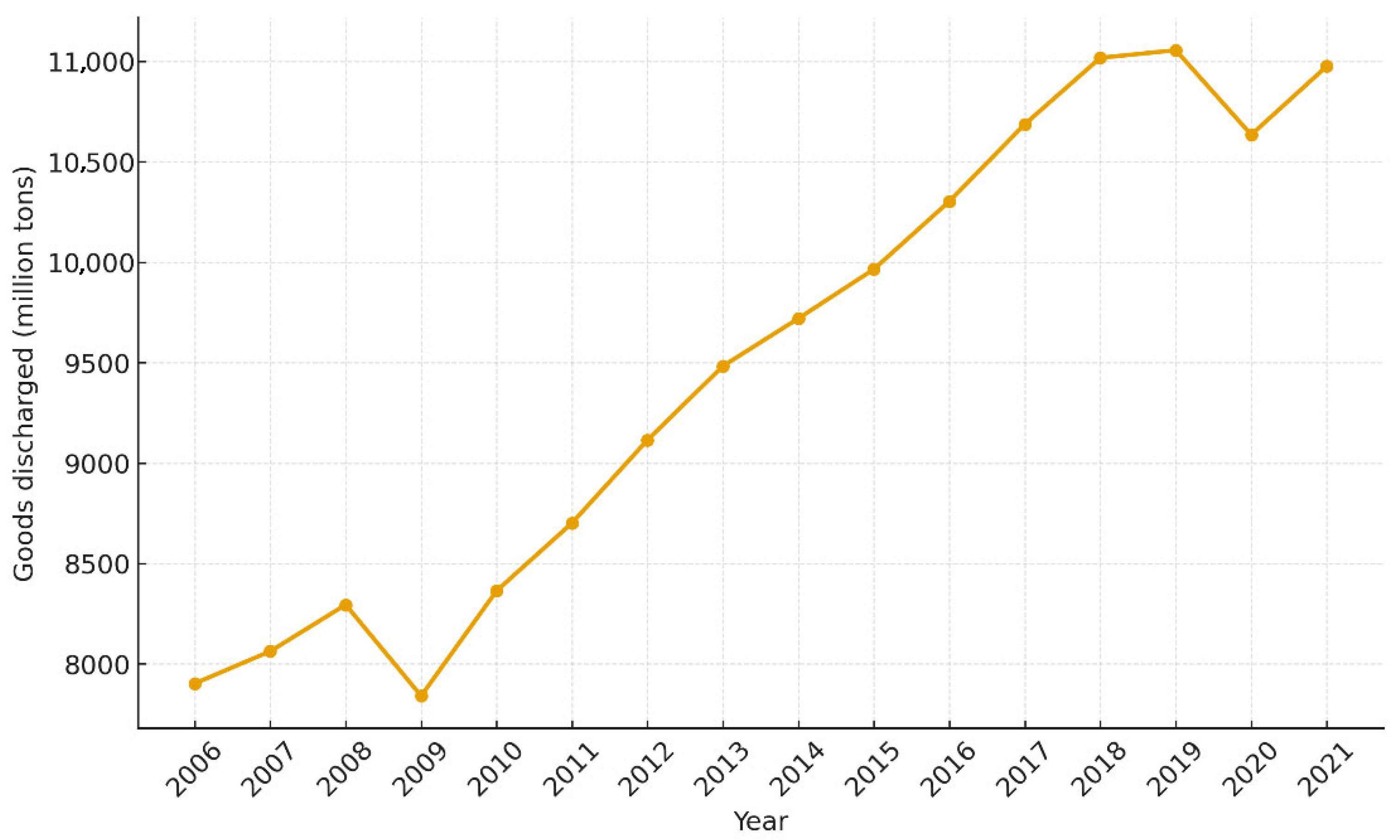 20]. Despite the temporary slowdown caused by the COVID-19 pandemic, global maritime freight volumes have shown a steady upward trend over the past two decades according to UNCTAD statistics [