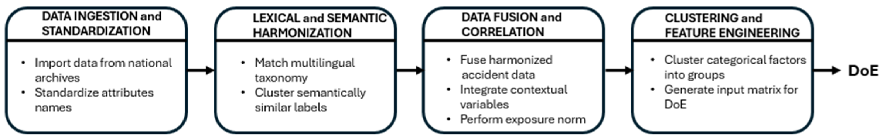 To address these challenges, the present study proposes a structured data-fusion and experimental analysis framework that explicitly tackles the problem of data heterogeneity. The approach combines the following: Extract–Transform–Load (ETL) procedures to ingest data from multiple national repositories and convert them into a common schema; lexical and semantic harmonization using multilingual taxonomy-matching to align inconsistent classification systems; and DoE methods to quantify the effects and interactions among operational, socio-economic, and contextual factors influencing accident rates.