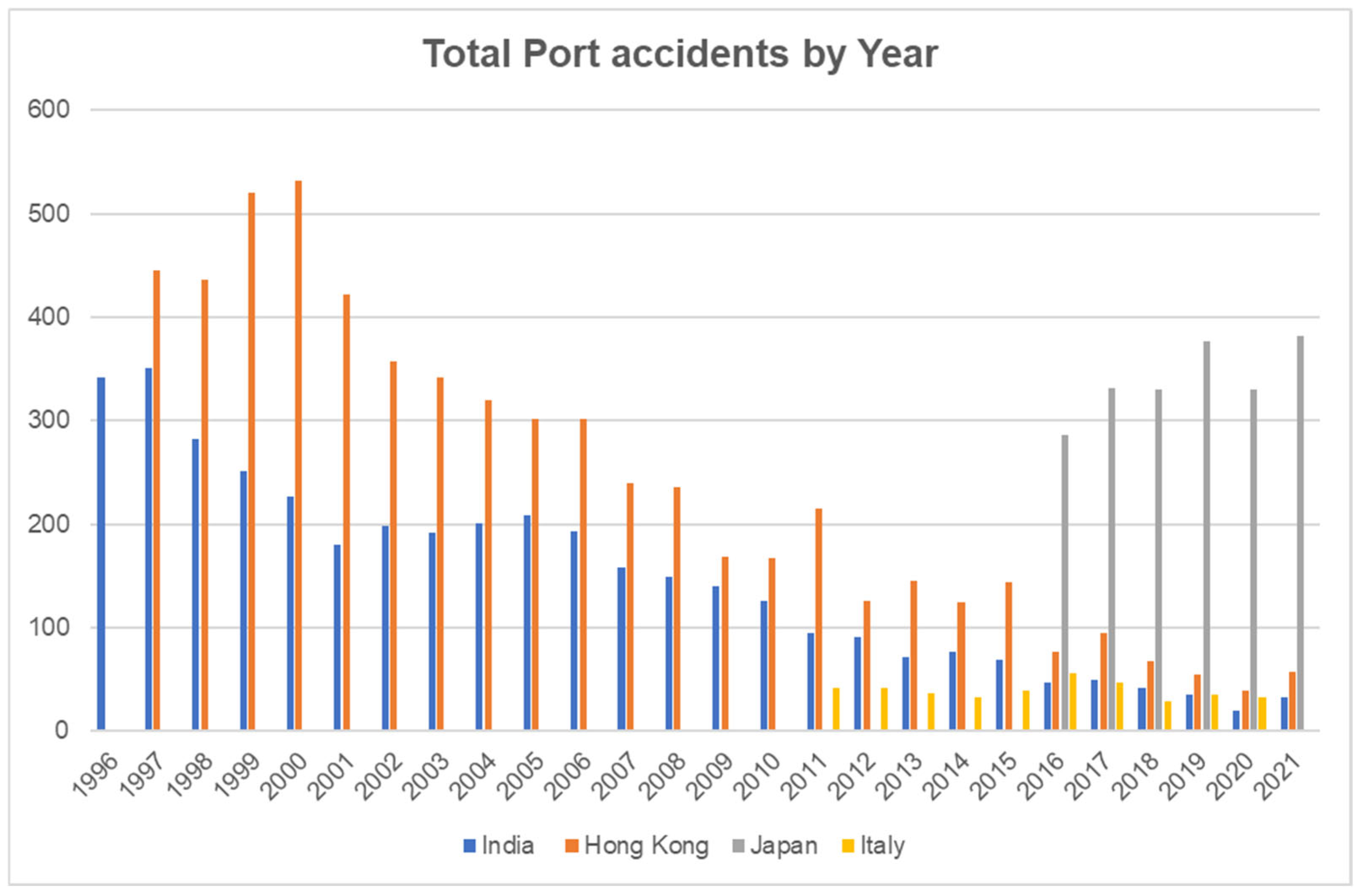 The number of accidents by year was compared, considering both fatal and non-fatal accidents extracted by the framework developed. The comparison considered ports of Hong Kong, Japan, Italy, and India.