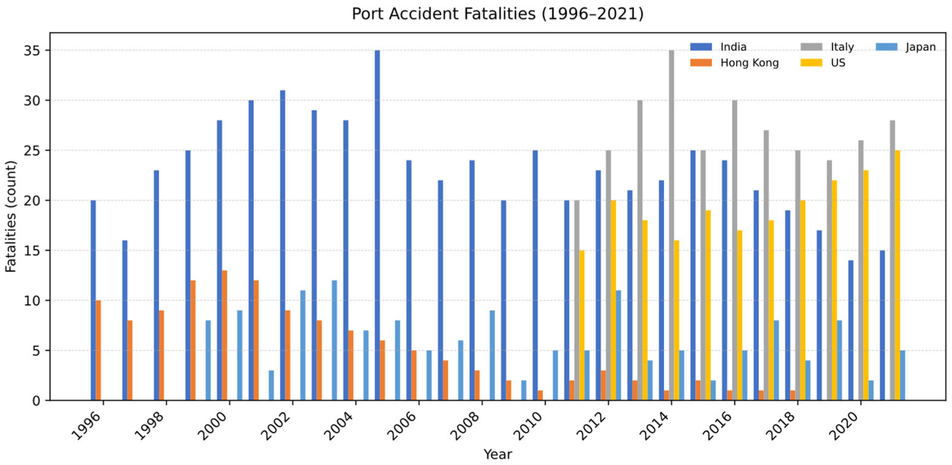 The selection of countries for this study was guided by three main criteria: data availability, economic representativeness, and geographic diversity. The chosen cases—Hong Kong, India, Italy, Japan, and the United States—offer sufficiently complete and continuous accident records suitable for multi-year comparison, while also representing distinct stages of industrial and technological development. Hong Kong and Japan exemplify highly digitized port systems in advanced economies; India reflects a rapidly developing maritime sector with increasing automation; Italy provides a representative case of mature European port governance; and the United States contributes long-term, systematically reported data from a large-scale logistics environment.