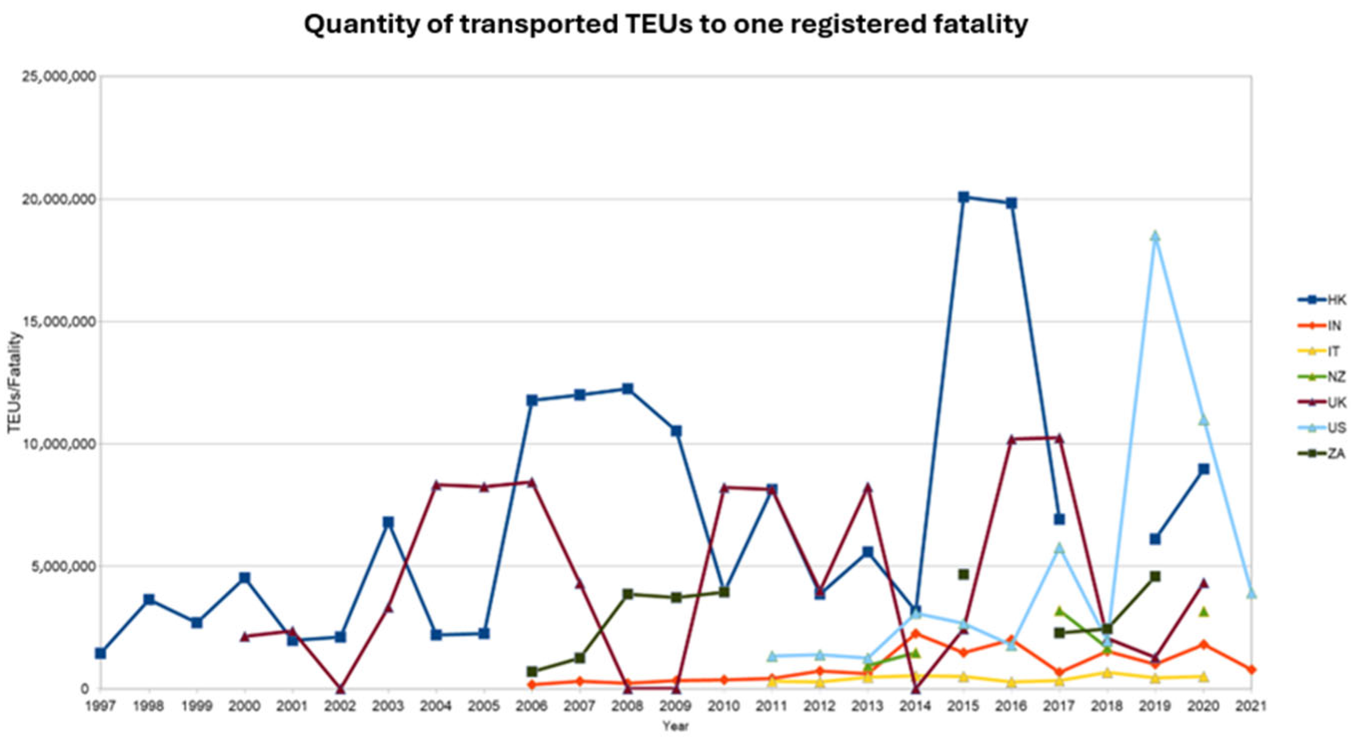 Figure 5 illustrates the relationship between container throughput and recorded fatalities for the countries included in the study over the 1997–2021 period. The ratio—expressed as the number of transported TEUs per one registered fatality—provides a normalized measure of safety efficiency across port systems with different traffic volumes.