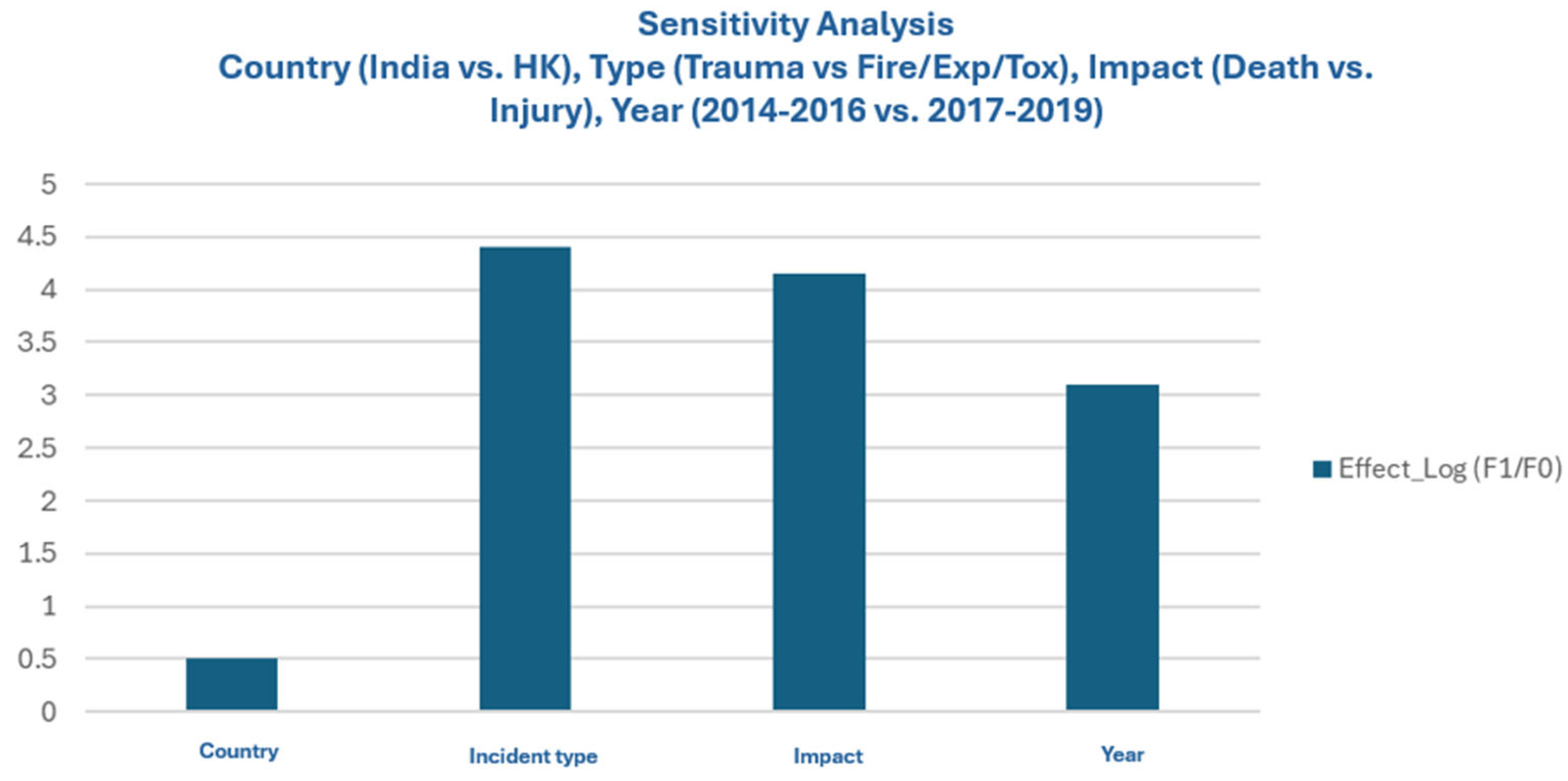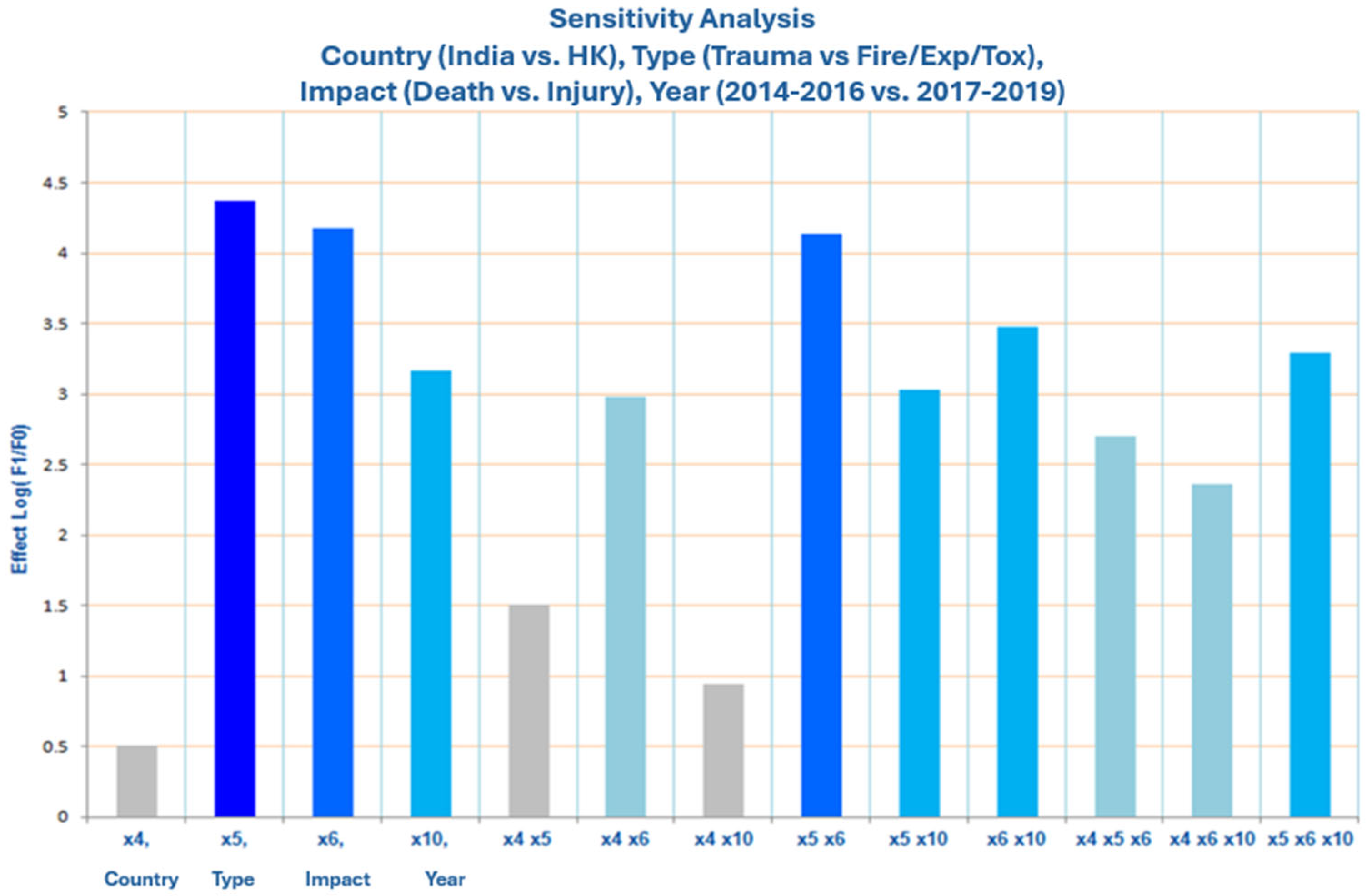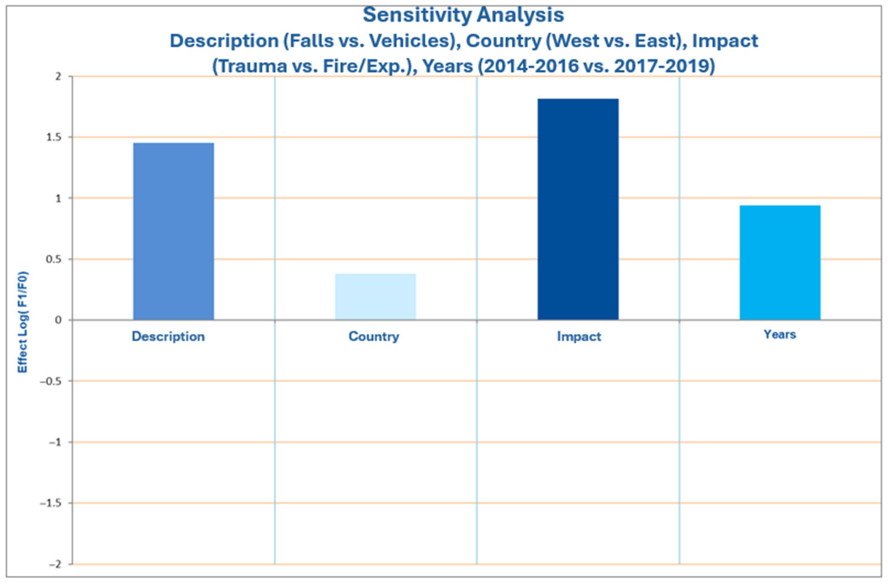 Figure 8 shows the relative influence of four variables—type of accident (Falls vs. Vehicles), geographic area (West vs. East), type of impact (Trauma vs. Fires/Explosion/Intoxication), and time period (2014–2016 vs. 2017–2019)—on the observed variation of incidents. The effects are expressed as the logarithmic ratio of F-statistics (log(F/F