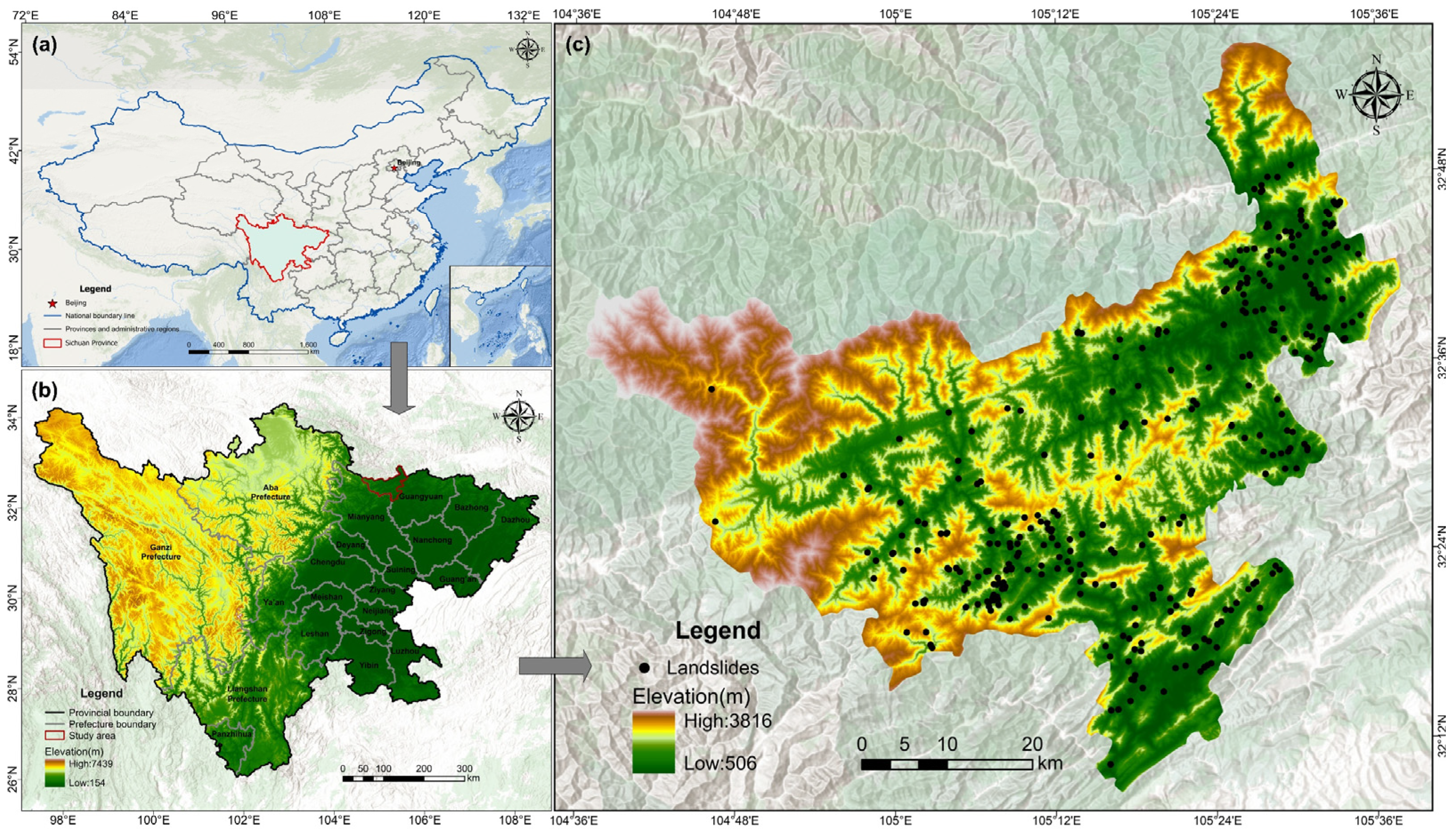 Location and landslide distribution of the study area. (a) Location of Sichuan Province in China; (b) Topography and administrative divisions of Sichuan Province; (c) Elevation and landslide distribution in the study area.