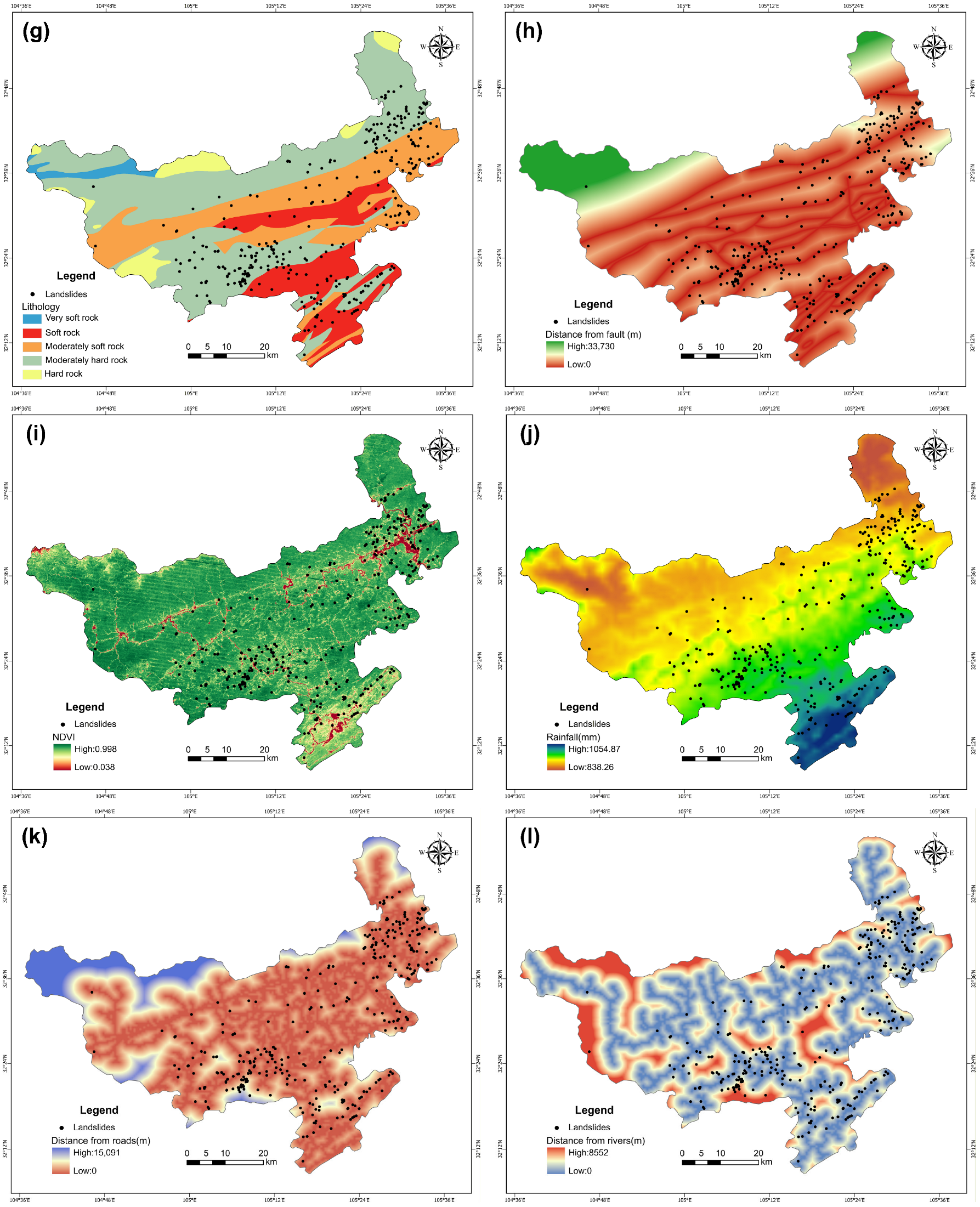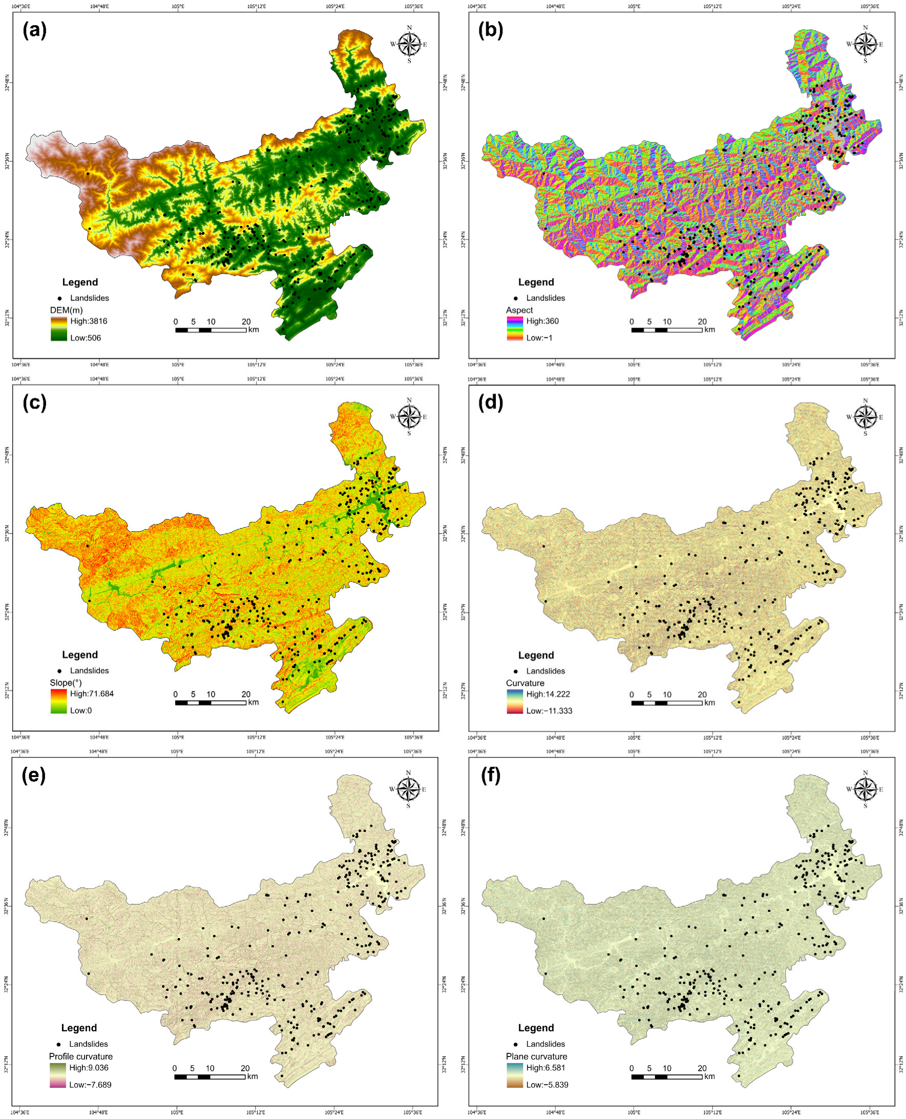 Some areas with relatively gentle terrain also exhibit high landslide susceptibility, primarily due to the combined effects of human disturbance and rainfall. In these regions, long-term agricultural cultivation and road construction have altered the original slope structure and drainage patterns, resulting in accelerated rainwater infiltration and a rise in groundwater levels. During periods of intense or sustained rainfall, the rapid increase in pore water pressure within the slopes weakens soil cohesion and frictional resistance, ultimately leading to landslides. In the northeastern part of the region, landslides are mainly distributed in dry farmland and grassland areas, while in the central and southern regions they are concentrated in paddy fields, dry farmlands, and grasslands. These land types are characterized by sparse vegetation, easily erodible surfaces, and strong runoff effects during rainfall. Overall, the high landslide susceptibility in these regions reflects the combined influence of topography, rainfall, human activity, and vegetation degradation, rather than being determined by topography alone.