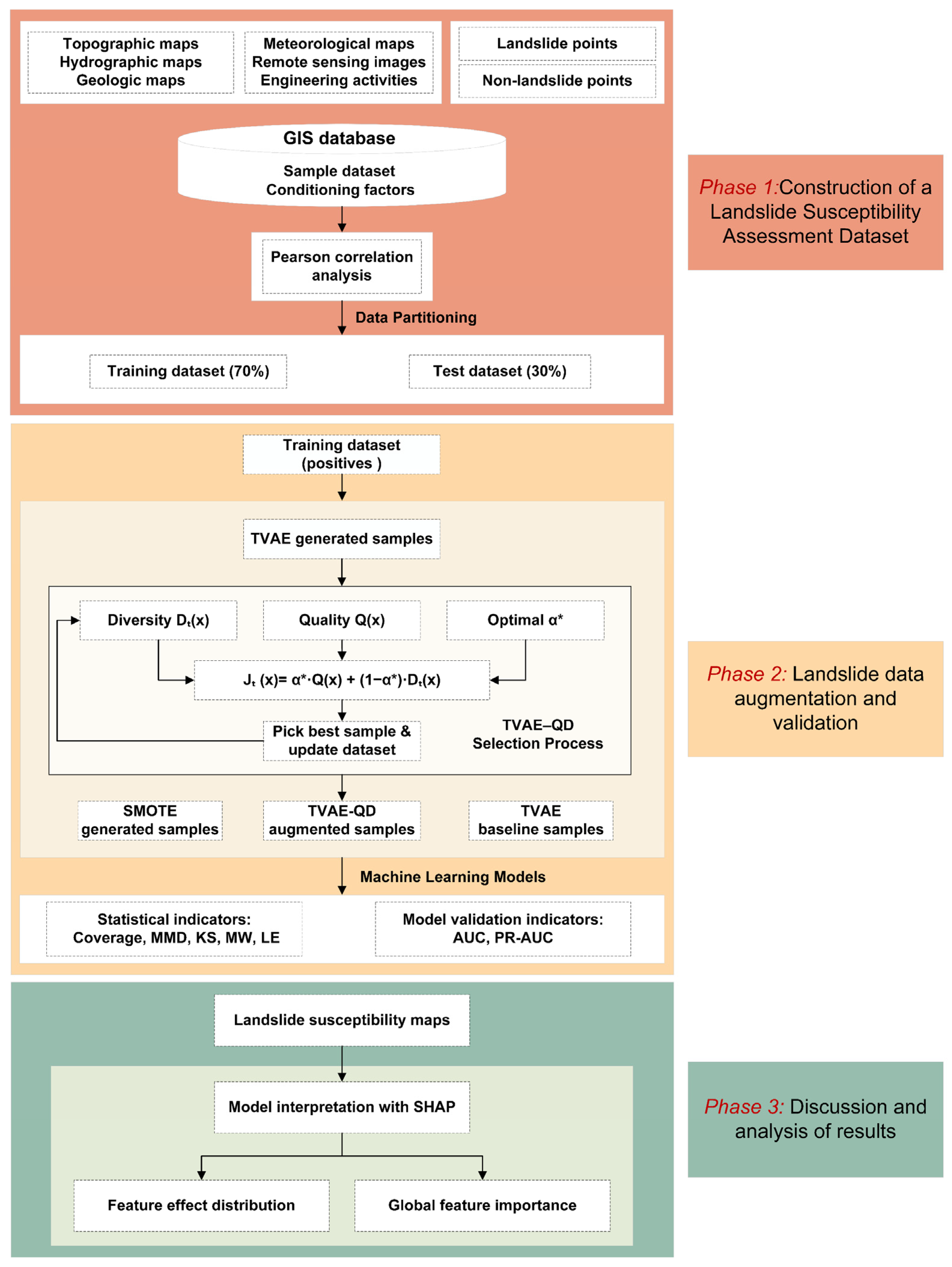 The workflow of this study is illustrated in Figure 3, which is divided into three phases: (1) construction of a landslide susceptibility assessment dataset, (2) landslide data augmentation and validation, and (3) discussion and analysis of results.