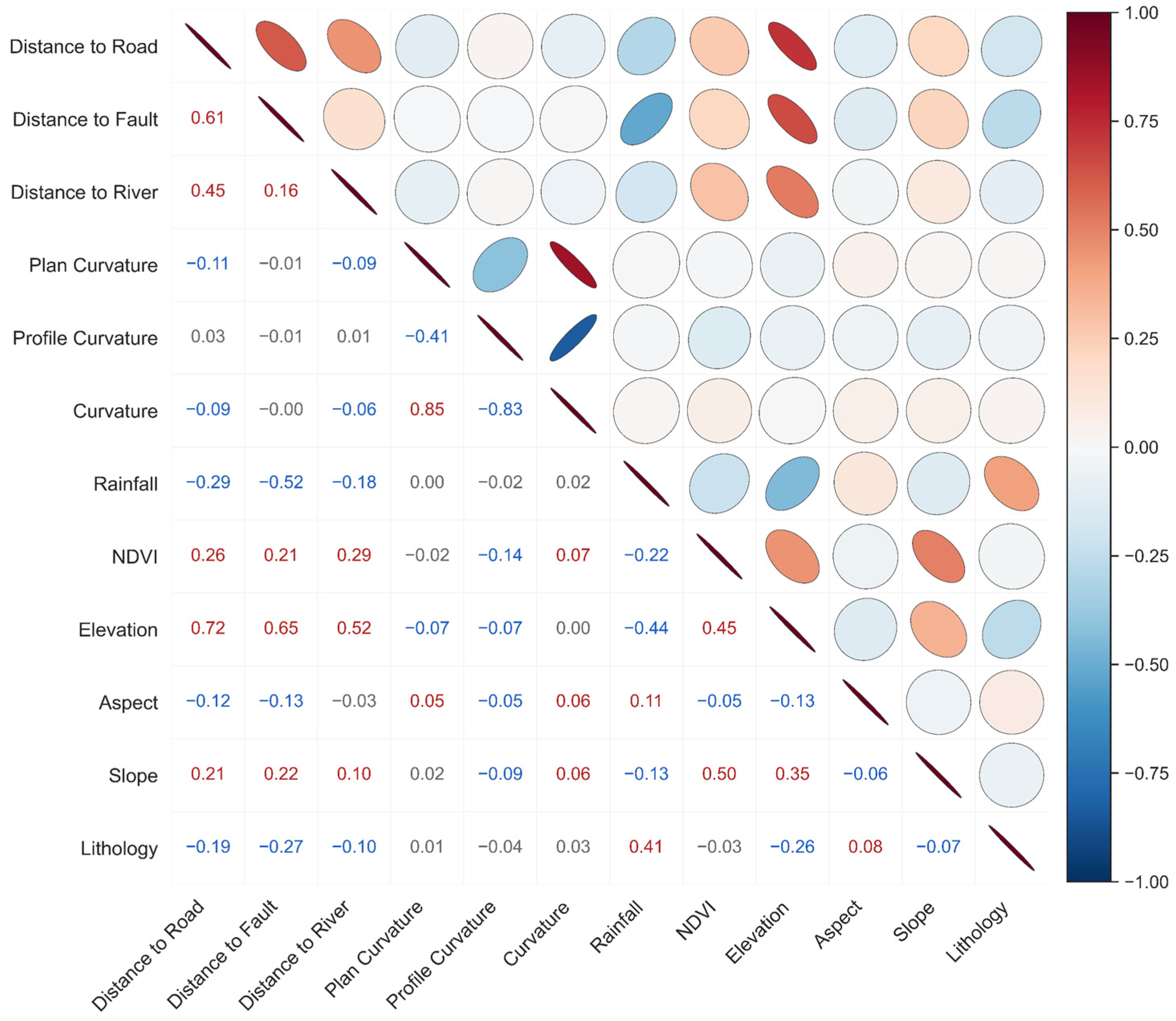 To examine potential linear dependencies among conditioning factors, we applied Pearson’s correlation coefficient (r). Figure 4 displays the correlation matrix, with the color scale representing both the direction and strength of associations. Elevation shows strong positive correlations with distance to roads (r = 0.72), distance to faults (r = 0.65), and distance to rivers (r = 0.52). This pattern suggests that major roads and rivers are primarily distributed in low-elevation valleys, which are often associated with fault zones. Consequently, as elevation increases, the distance to these geomorphic features correspondingly becomes larger.