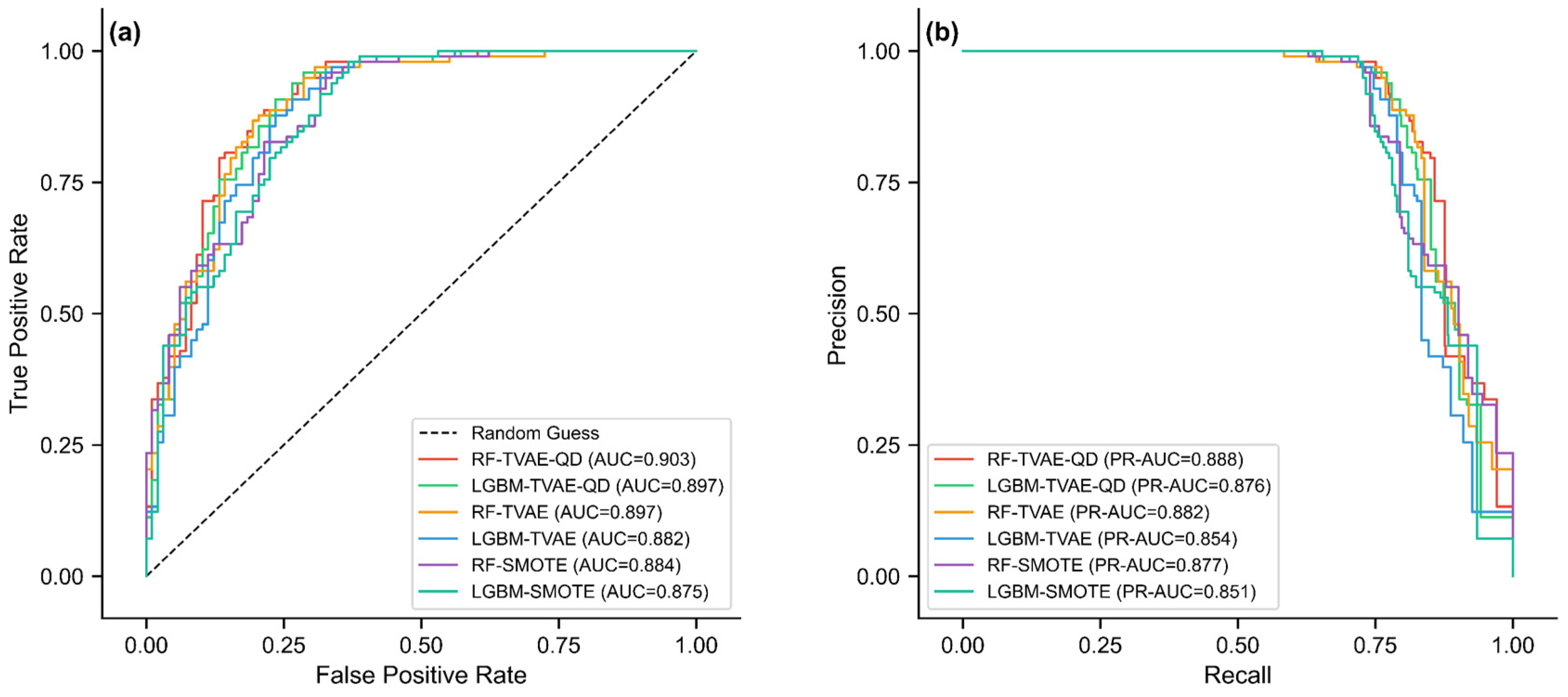 As shown in Figure 6, the ROC-AUC values of the TVAE–QD framework under the RF and LightGBM models are 0.903 and 0.897, respectively, both higher than those of TVAE (0.897 and 0.882) and SMOTE (0.884 and 0.875). On the PR curves, the PR-AUC values of TVAE–QD are 0.888 (RF) and 0.876 (LightGBM), also outperforming TVAE (0.882 and 0.854) and SMOTE (0.877 and 0.851). These results indicate that, compared with TVAE and SMOTE, the TVAE–QD framework achieves superior overall classification performance.