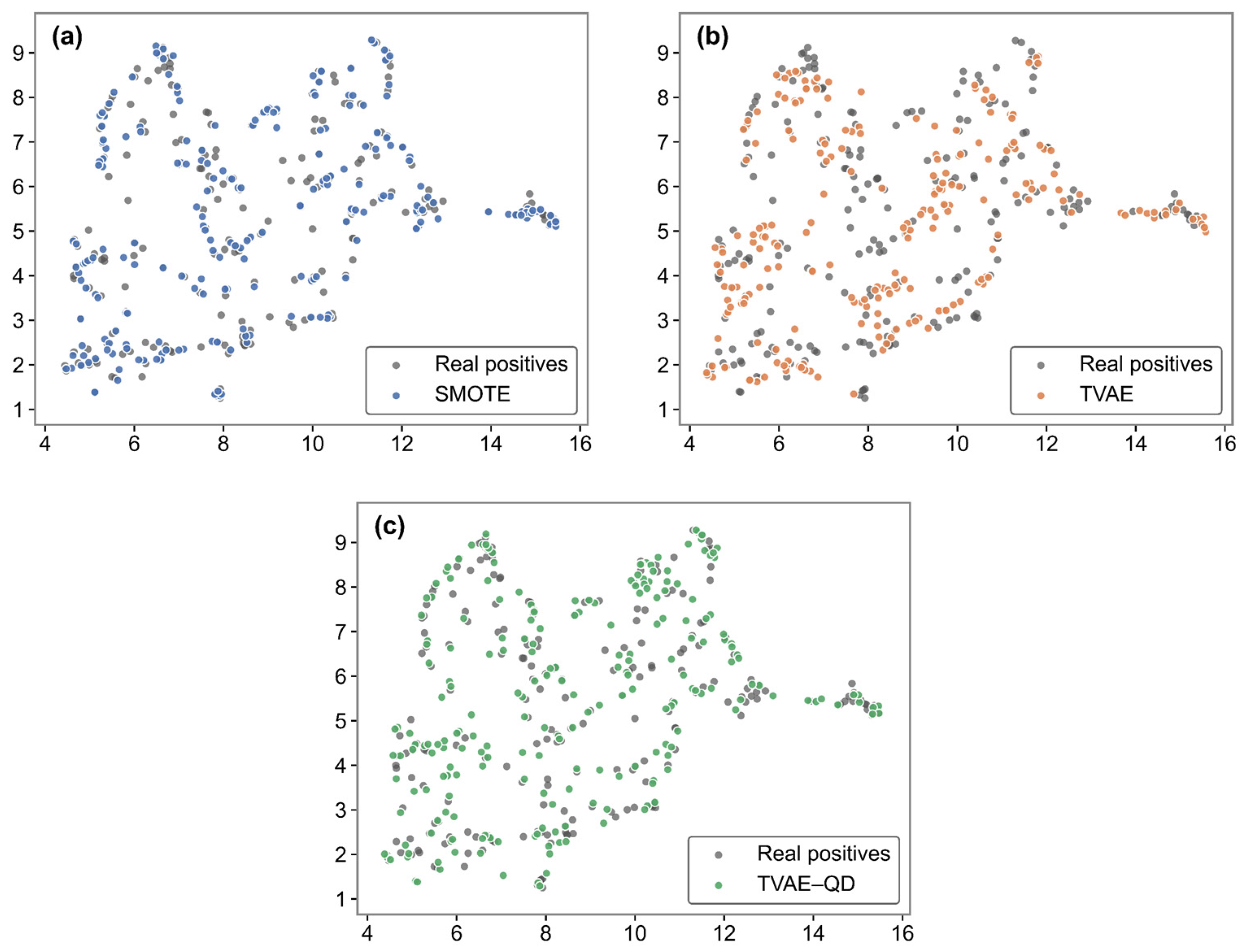 Two-dimensional UMAP visualization of real positive samples and synthetic samples generated by three different methods: (a) SMOTE, (b) TVAE, and (c) TVAE-QD.