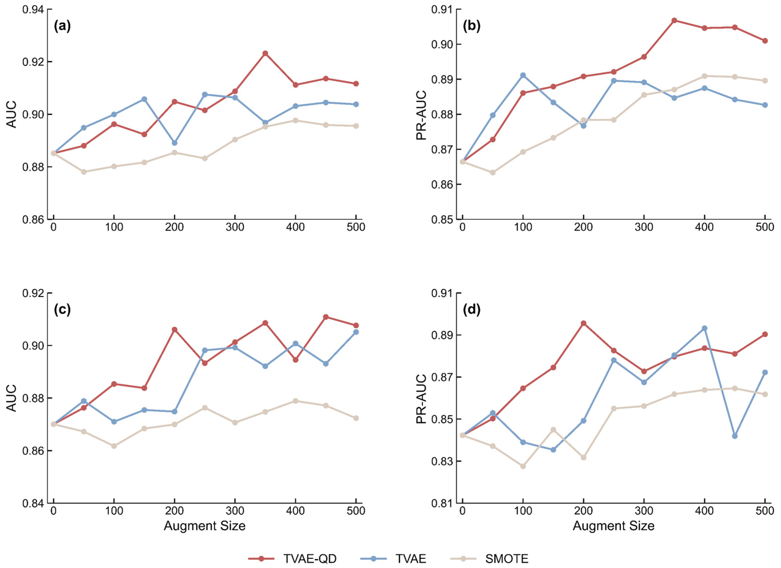 Figure 8 illustrates the performance of TVAE–QD, TVAE, and SMOTE under different augmentation scales. In the Random Forest model, the AUC and PR–AUC of TVAE–QD gradually increase with the augmentation scale, reaching 0.923 and 0.907 at scale 350.