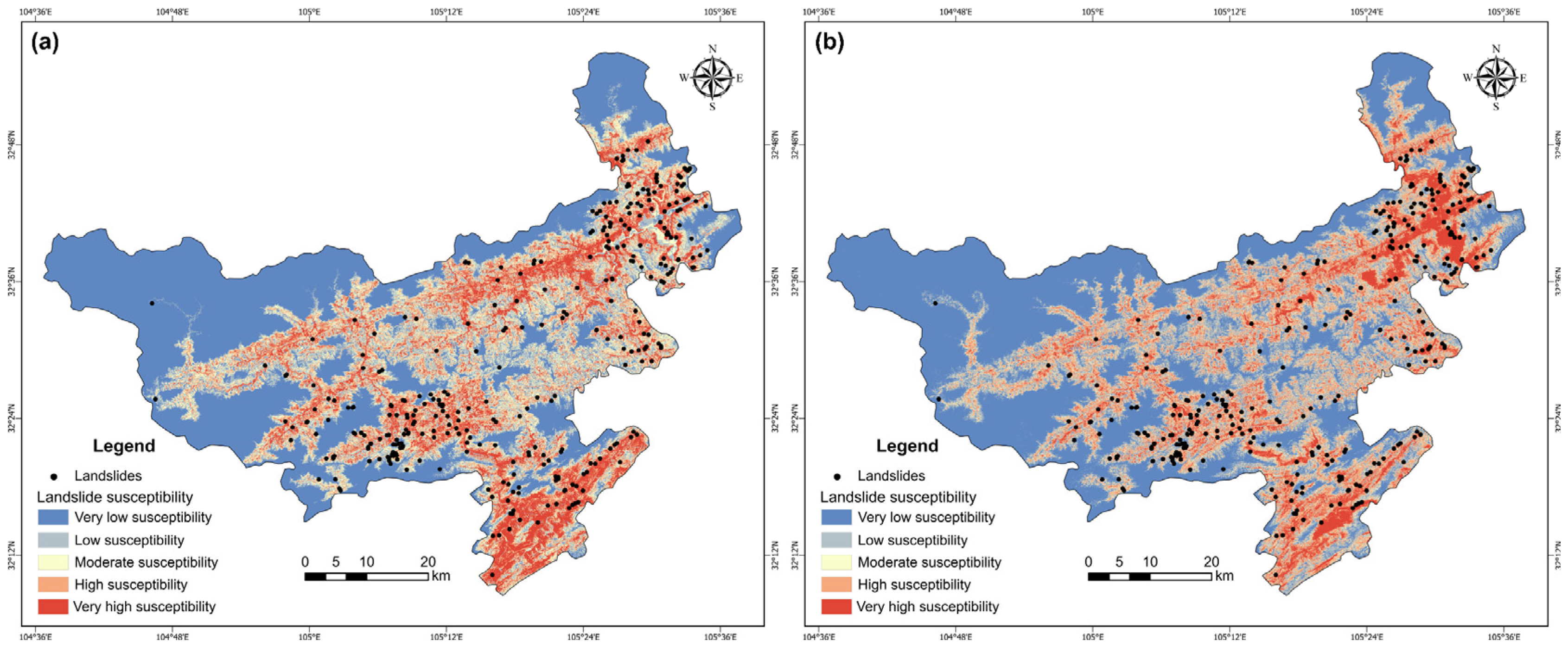 Overall, the spatial pattern of landslides in Qingchuan County results from the combined influence of topographic conditions, rainfall processes, and human activities. River incision and terrain relief provide the geomorphic foundation for landslide development, while rainfall acts as both a triggering and amplifying factor. Meanwhile, land-use changes and vegetation degradation locally intensify this geomorphic response, leading to significantly higher landslide susceptibility in specific areas.