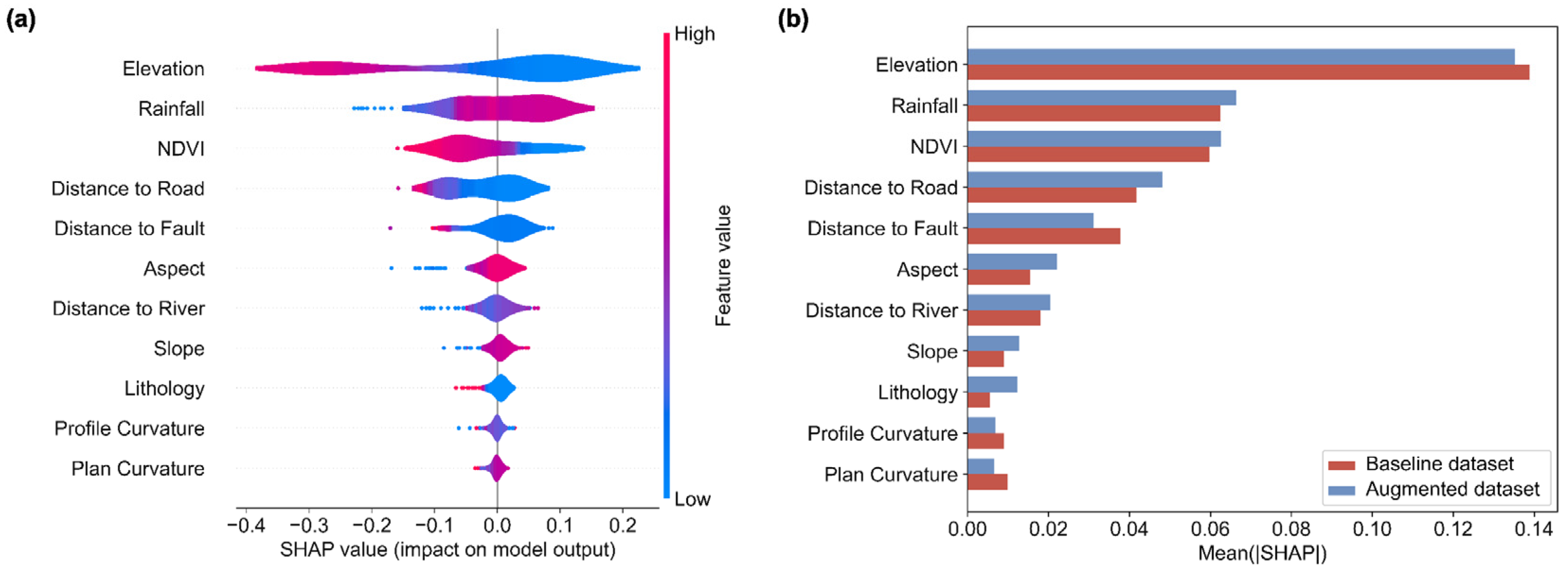 Figure 11b compares the global feature importance between the model trained on the baseline dataset and the model trained on the augmented dataset. The augmented model assigns greater weights to the dominant factors, particularly elevation and rainfall, while the overall ranking of variables remains largely unchanged, with only minor shifts among secondary factors. This indicates that QD-based augmentation slightly adjusts feature importance without disrupting the underlying contribution logic, thereby ensuring the stability and interpretability of the model results.