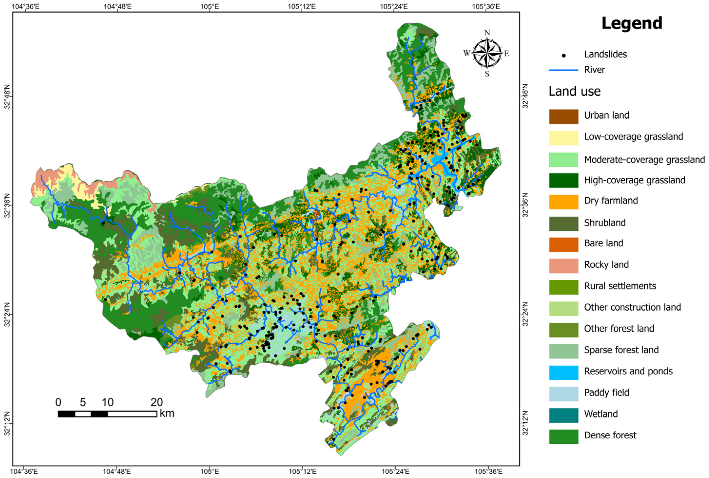 The landslide susceptibility prediction results for Qingchuan County, as shown in Figure 9, are generally consistent with the spatial distribution of historical landslides. Based on the land use map in Figure 12, which illustrates rivers, land use types, and the recorded landslide locations, it can be observed that high-susceptibility zones are mainly distributed along rivers and their tributaries, concentrated in the transitional areas between hills and low mountains. These regions are characterized by rugged terrain, deeply incised valleys, and abundant but unevenly distributed rainfall, where intense rainfall events easily trigger slope instability. Roads and villages are mostly located along river valleys, making these areas particularly prone to frequent landslides. Overall, topography and rainfall conditions are the primary controlling factors for the spatial distribution of landslides, while human activities in geomorphologically and climatically sensitive regions further amplify the landslide risk.