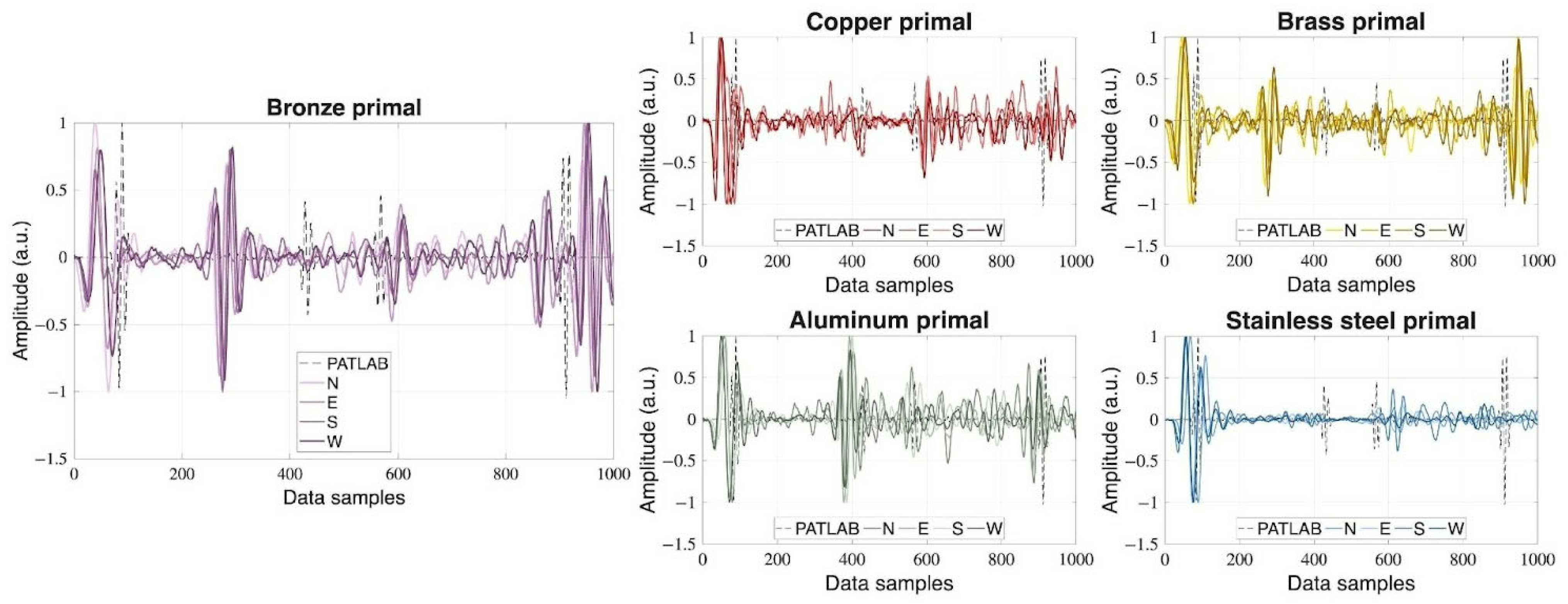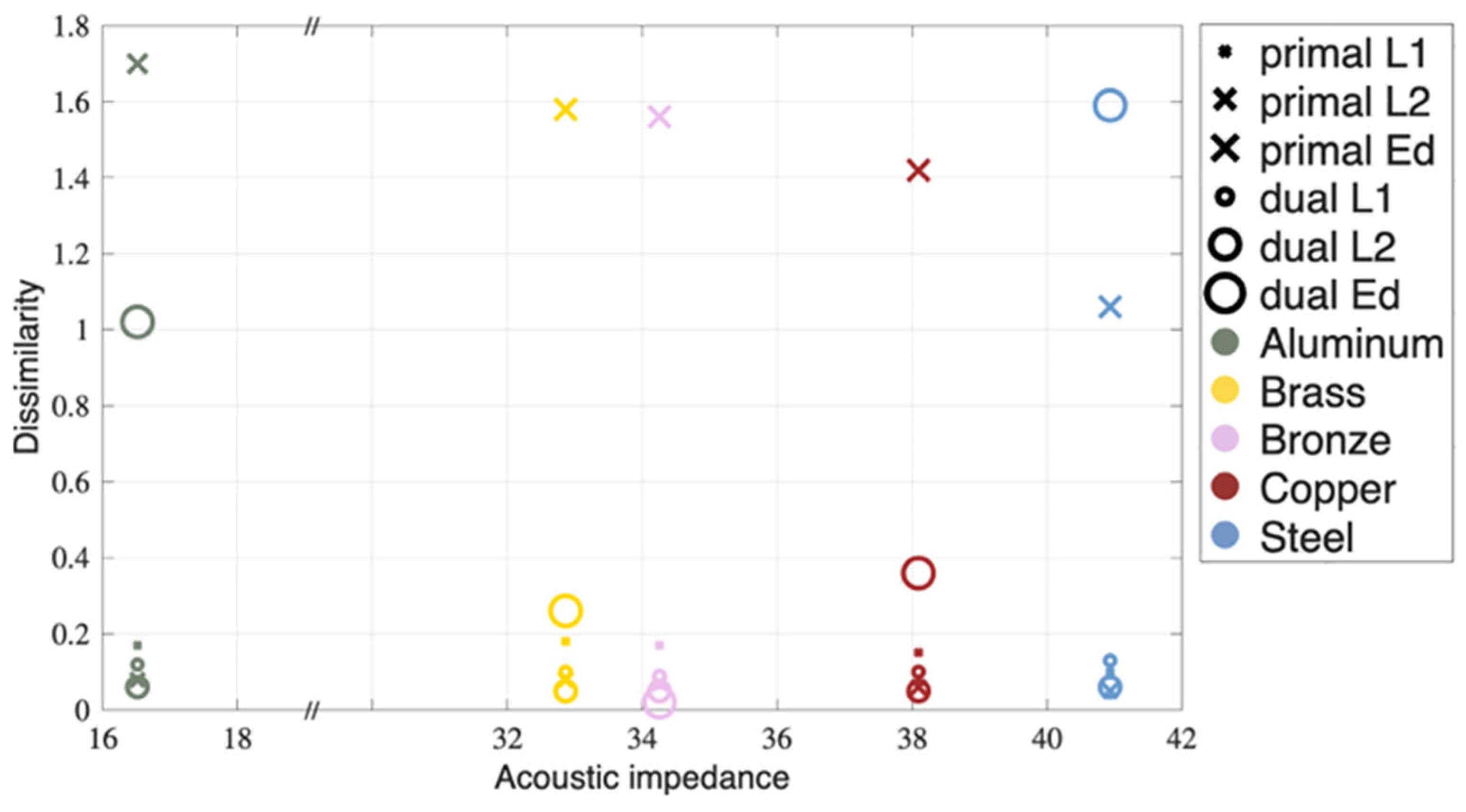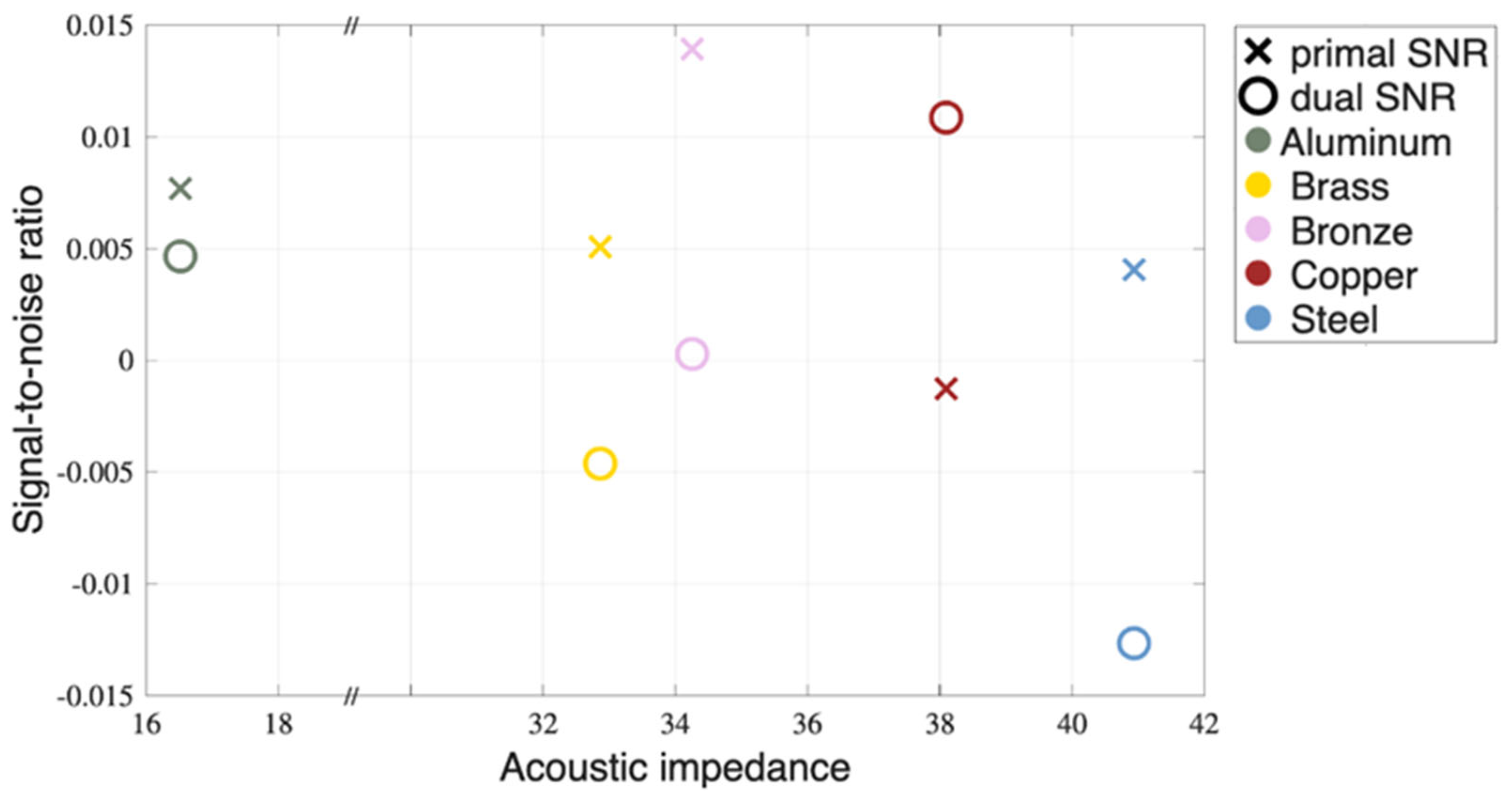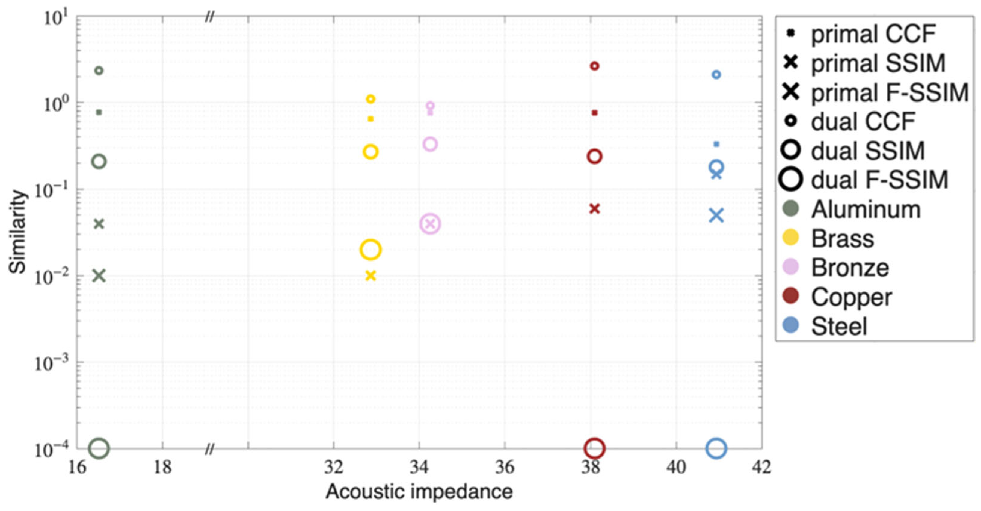 The sound velocity within each metal, which we measured experimentally, is another crucial parameter. The sequence of sound velocities (Aluminum > Stainless steel > Copper > Bronze ≈ Brass) directly influences the time-of-flight of acoustic waves and thus the accuracy of the reconstruction algorithm in the primal mode. The proposed average propagation velocity model for the dual processing, which weights the sound velocity in metal and water by the reflection coefficient, apparently balances this influence.