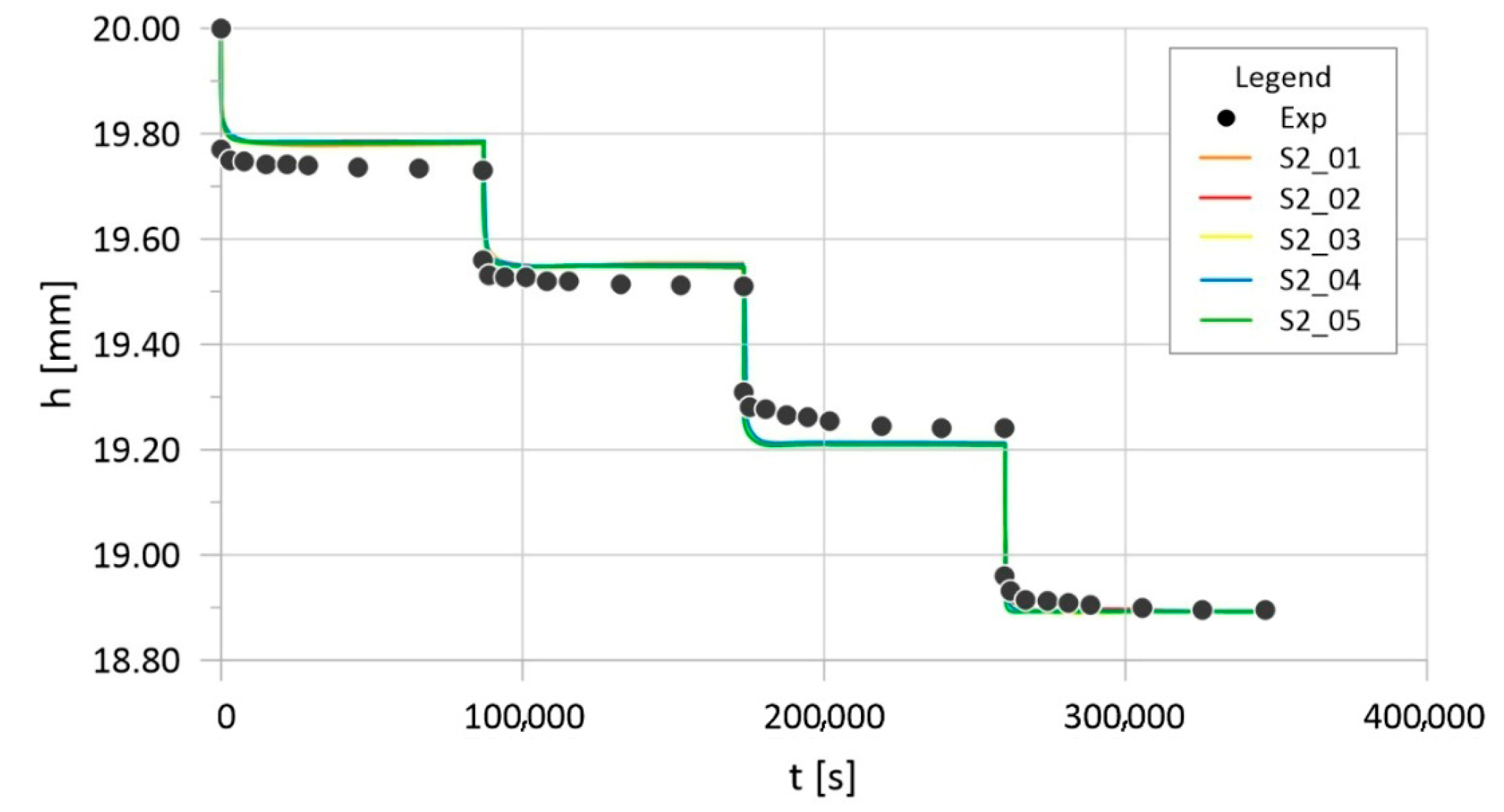 | Num | N [107 Pa] | A [108 Pa] | R [108 Pa] | H [108 Pa] | k [10−11 m/s] | Fc [108] | Δ [mm] |