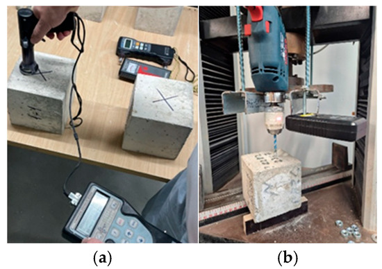 Figure 1. Non-destructive testing of concrete with: (a) rebound hammer and ultrasonic tester; (b) drilling device setup.