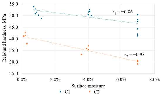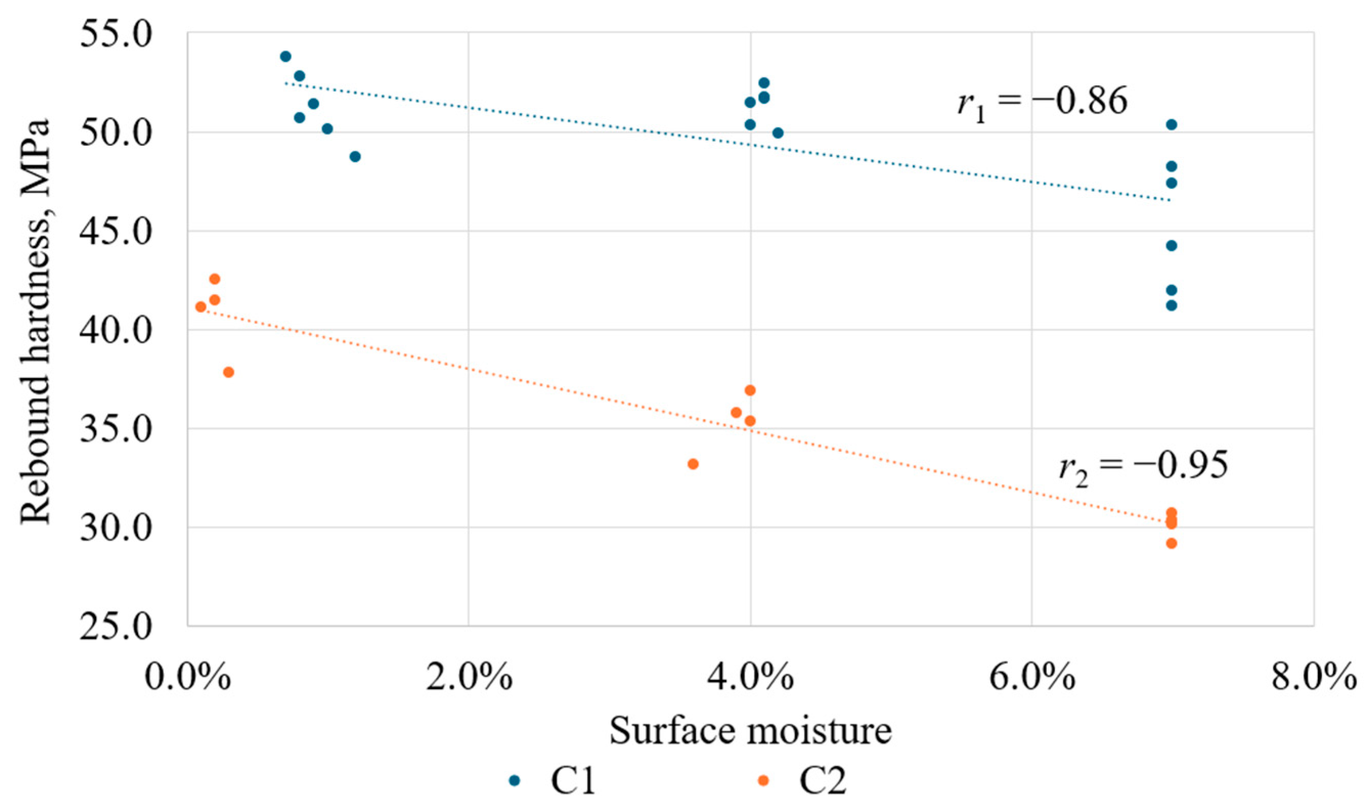 The rebound hardness (RH) test was carried out to assess the surface hardness and estimated compressive strength of the concrete specimens with different W/C ratios. The results, shown in Figure 4, indicate a negative correlation between surface MC and RH values, with a correlation coefficient of r1 = −0.86, demonstrating a high inverse relationship. The effect of W/C ratio on RH results exhibits two distinct trends: (i) C1 consistently shows higher rebound values, reaching up to 50 MPa under dry conditions and gradually decreasing with increasing MC. C2 shows a lower RH, with initial values around 40 MPa, which further declines with increasing MC. This reduction in rebound values aligns with the previous findings: C1, having a lower W/C ratio, higher density, and lower porosity, achieves higher surface hardness and compressive strength. Conversely, C2, with higher W/C and increased porosity, results in a weaker matrix, leading to lower rebound values.