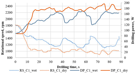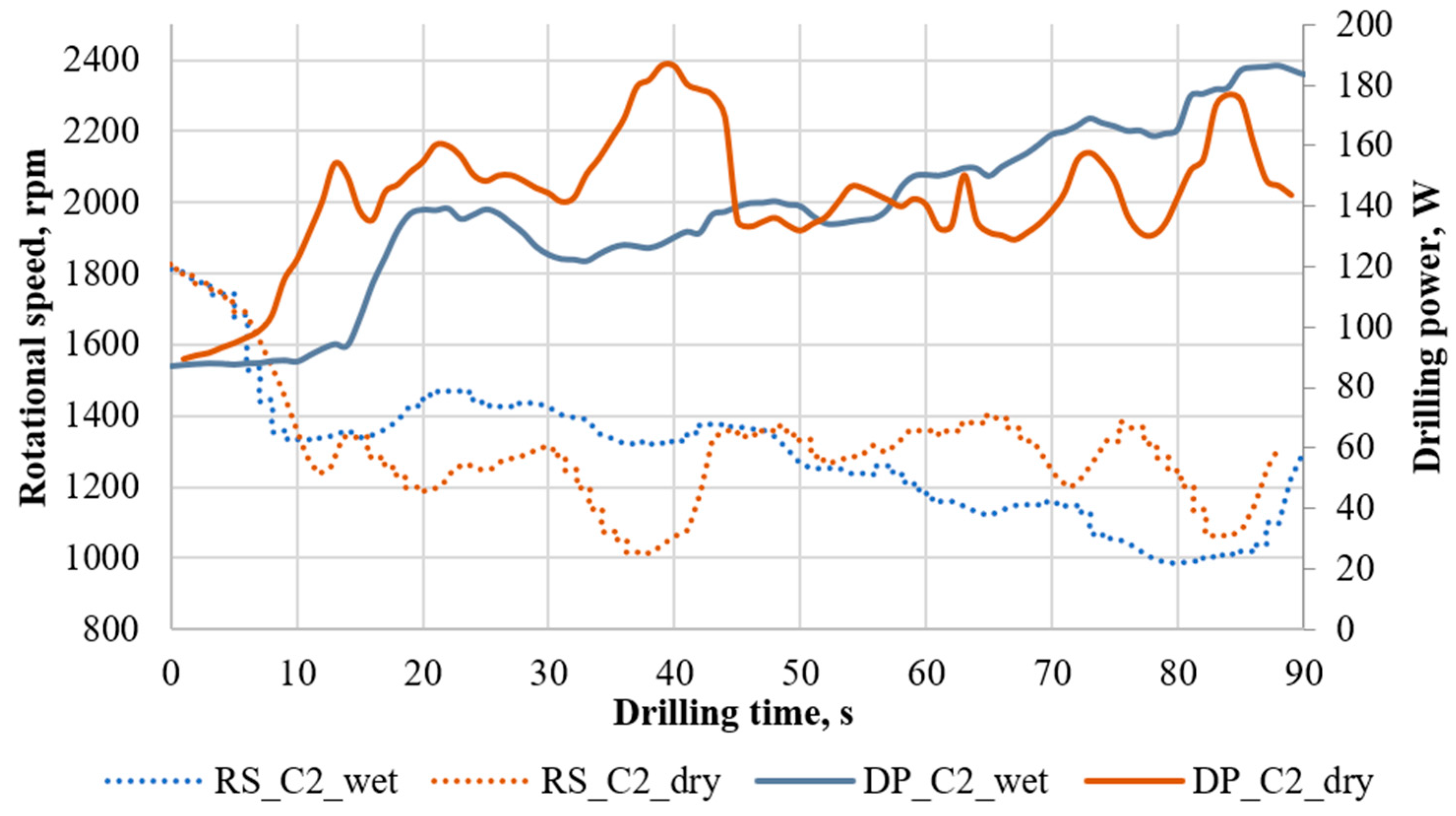 Figure 6. Drilling resistance of C2 concrete. RS-rotational speed, DP-drilling power.