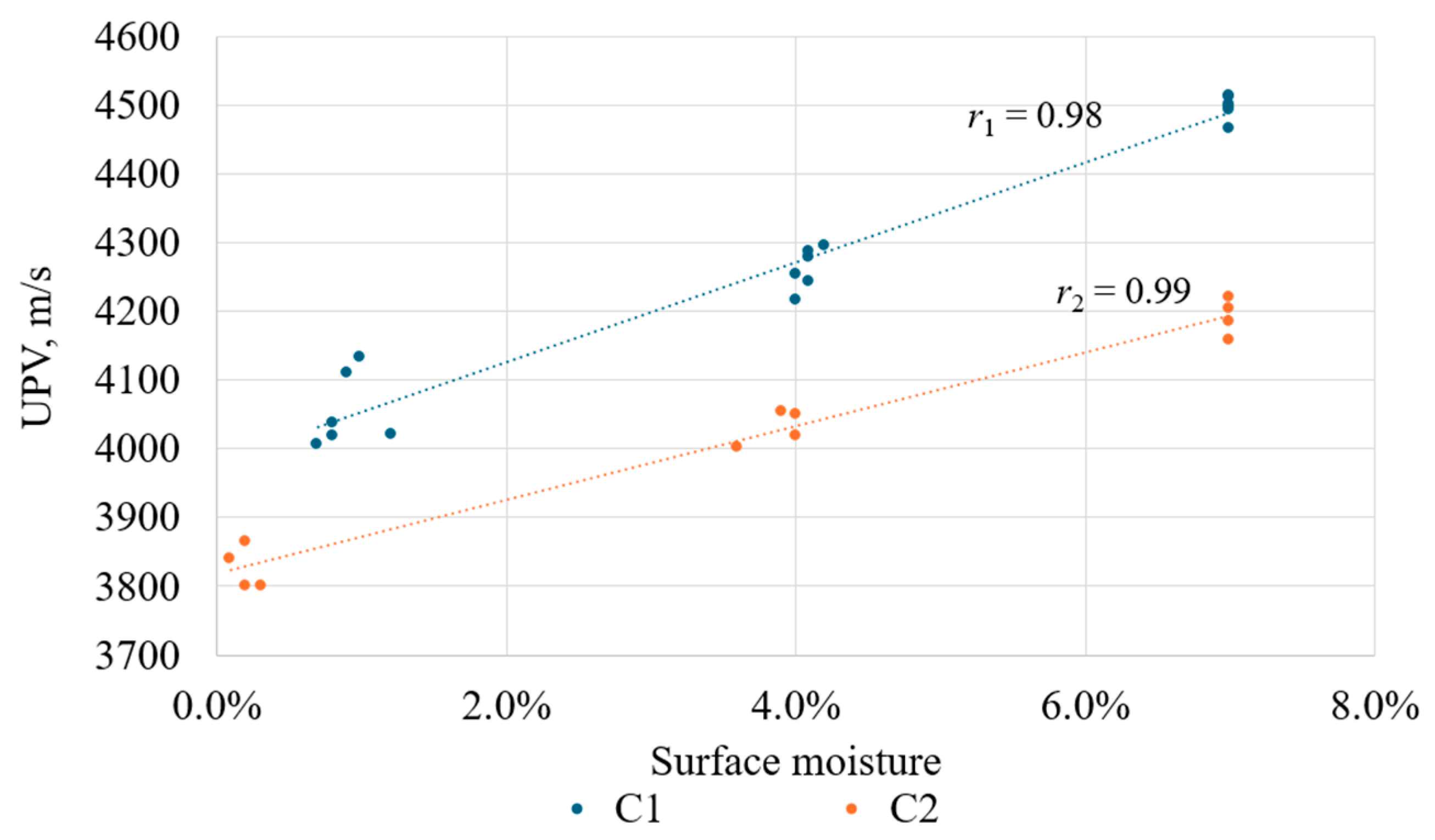 The Ultrasonic Pulse Velocity (UPV) test was carried out to evaluate the internal structure and compactness of the concrete compositions with different W/C ratios and moisture conditions. The results given in Figure 3 indicate a strong correlation between surface MC and UPV values, with an observed correlation coefficient r1 = 0.98 and r2 = 0.99 for C1 and C2, respectively, signifying a high degree of linear dependence. The UPV measurements reveal two distinct trends: (i) C1 exhibits higher UPV values, reaching up to 4400 m/s at 6.0% surface moisture. (ii) C2 demonstrates consistently lower UPV values, with maximum values around 4150 m/s under the same moisture conditions. These findings indicate that C1 has a denser microstructure, likely due to its lower interfacial transition zone (ITZ) porosity and reduced capillary voids, resulting from the optimized water-cement ratio and the use of a superplasticizer in comparison to mixture C2.