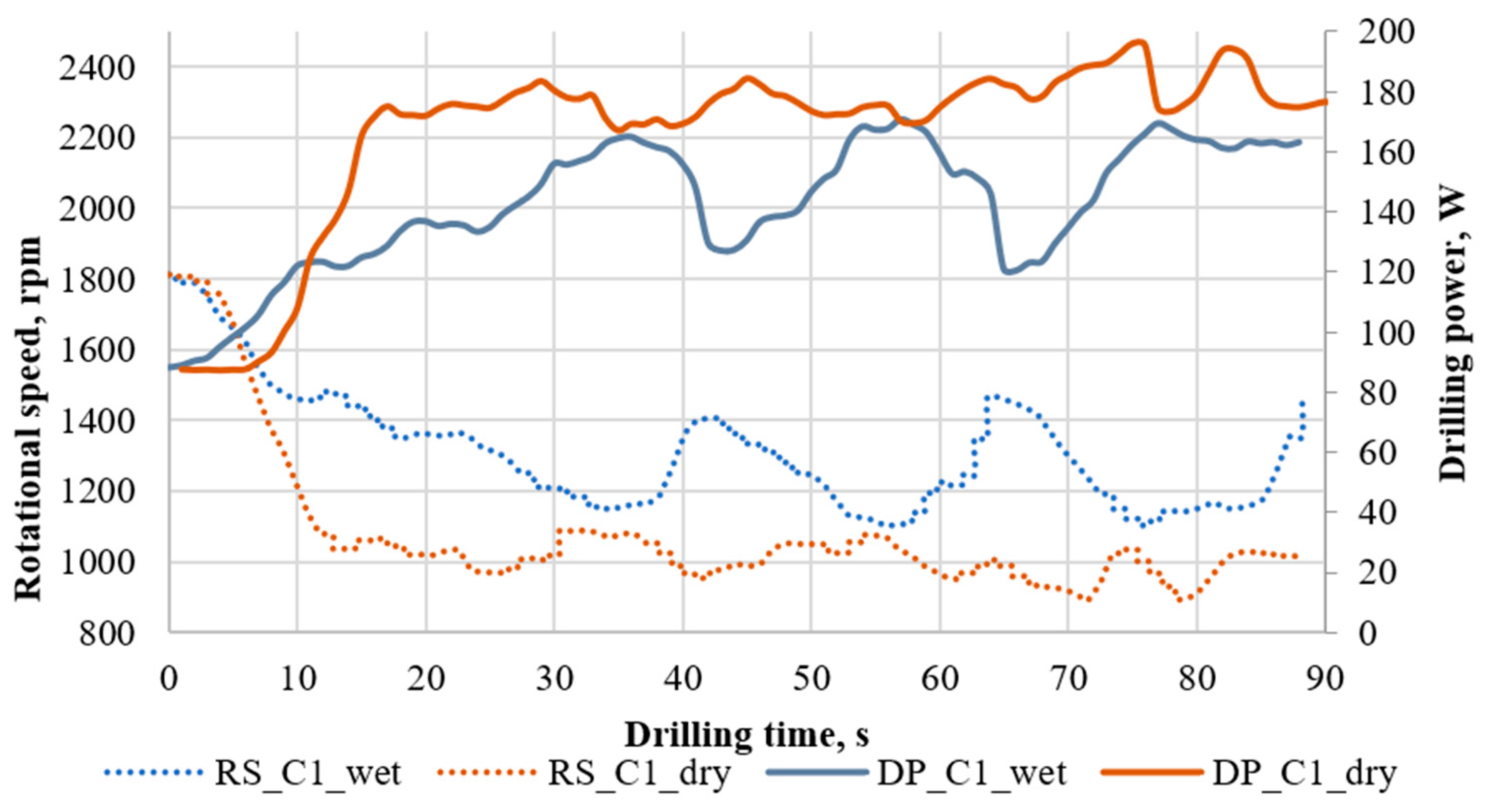 The comparative analysis of drilling rotational speed and power consumption highlights the impact of concrete strength and moisture conditions on drilling performance (Table 5). The rotational speed in wet concrete decreases within a range of −3% to −7%. By comparing rotational speed between C1 and C2 in both air-dry and wet conditions, the most significant difference (−13%) has been obtained in air-dry conditions, however, in wet concrete this difference drops to −9%, reinforcing the effect of moisture in lowering DR. Conversely, drilling power consumption increases in all comparisons, ranging from +7% to +9%, confirming that greater resistance requires more energy for penetration. The power increase for C1 and C2 concrete is 6% to 7%. This indicates that stronger concrete demands significantly more power than in dry conditions, and it is very close to the amount of change in rotational speed. Similarly, stronger C1 concrete requires more energy than C2 in a range of 8% to 9%.