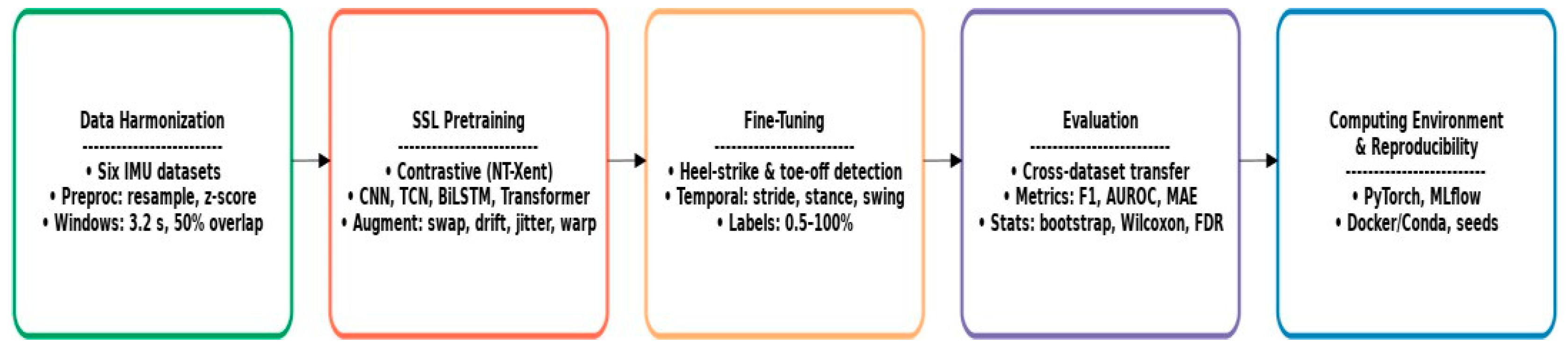 To rigorously evaluate the role of self-supervised learning in gait event detection, we established a unified experimental framework designed to ensure both reproducibility and generalizability. The overall methodological pipeline is illustrated in Figure 1, which clearly summarizes the sequential stages of data harmonization, self-supervised pretraining, downstream fine-tuning, evaluation protocol, and computing environment.