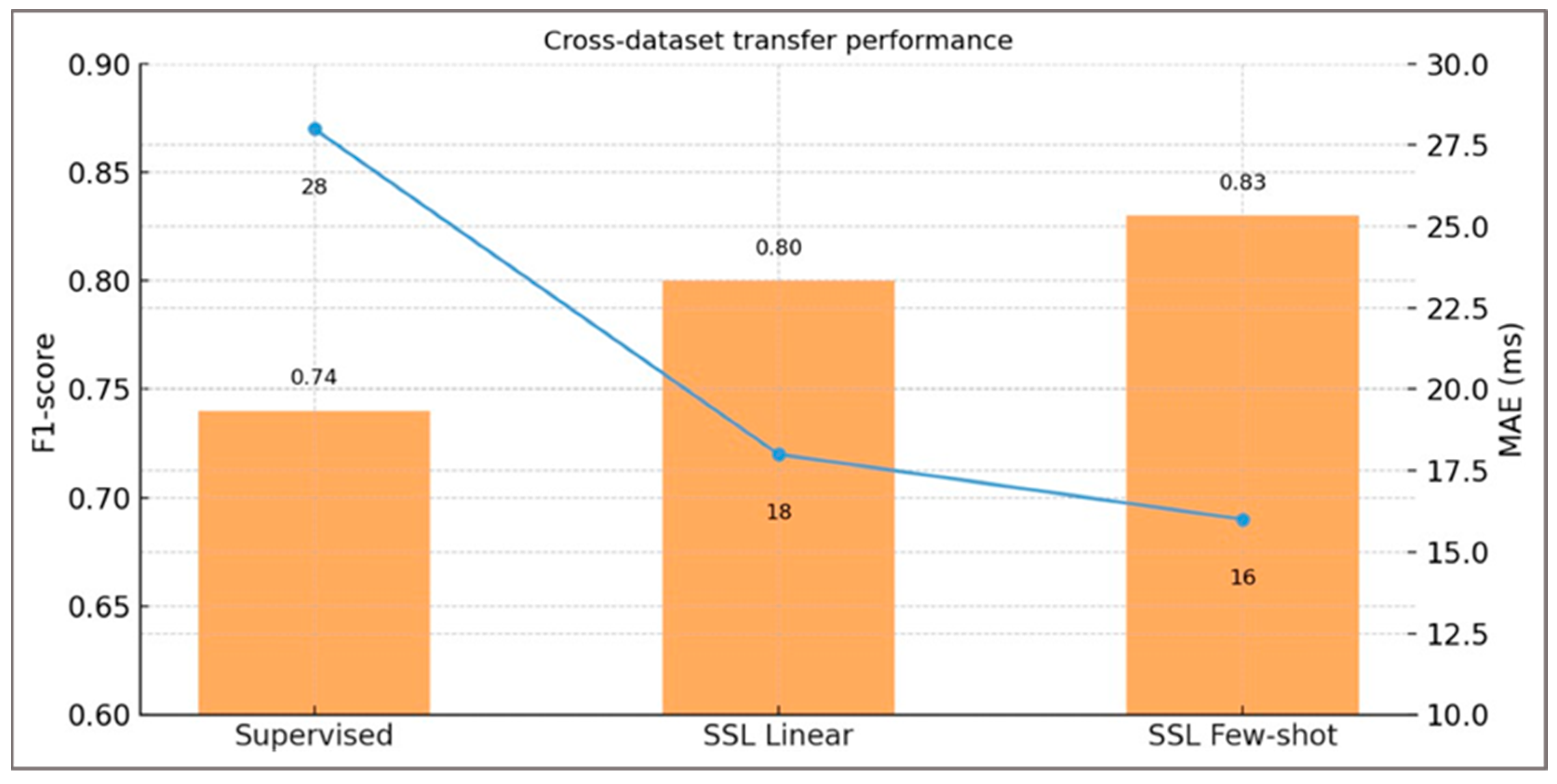 Performance was assessed across both event detection and temporal estimation tasks. For events, we reported F1-score, precision, and recall at the threshold maximizing F1 on a validation split of D, along with the area under the receiver operating characteristic curve (AUROC). For timing, we reported mean absolute error (MAE) and median absolute error (MedAE) in milliseconds relative to reference annotations. To account for variability across subjects, per-subject medians were summarized as median and interquartile range [IQR]. In addition, label-efficiency curves were generated to visualize performance as a function of annotation fraction, and transfer gaps were computed as the difference between in-domain and out-of-domain scores, Δ = (in-domain score) − (out-of-domain score).