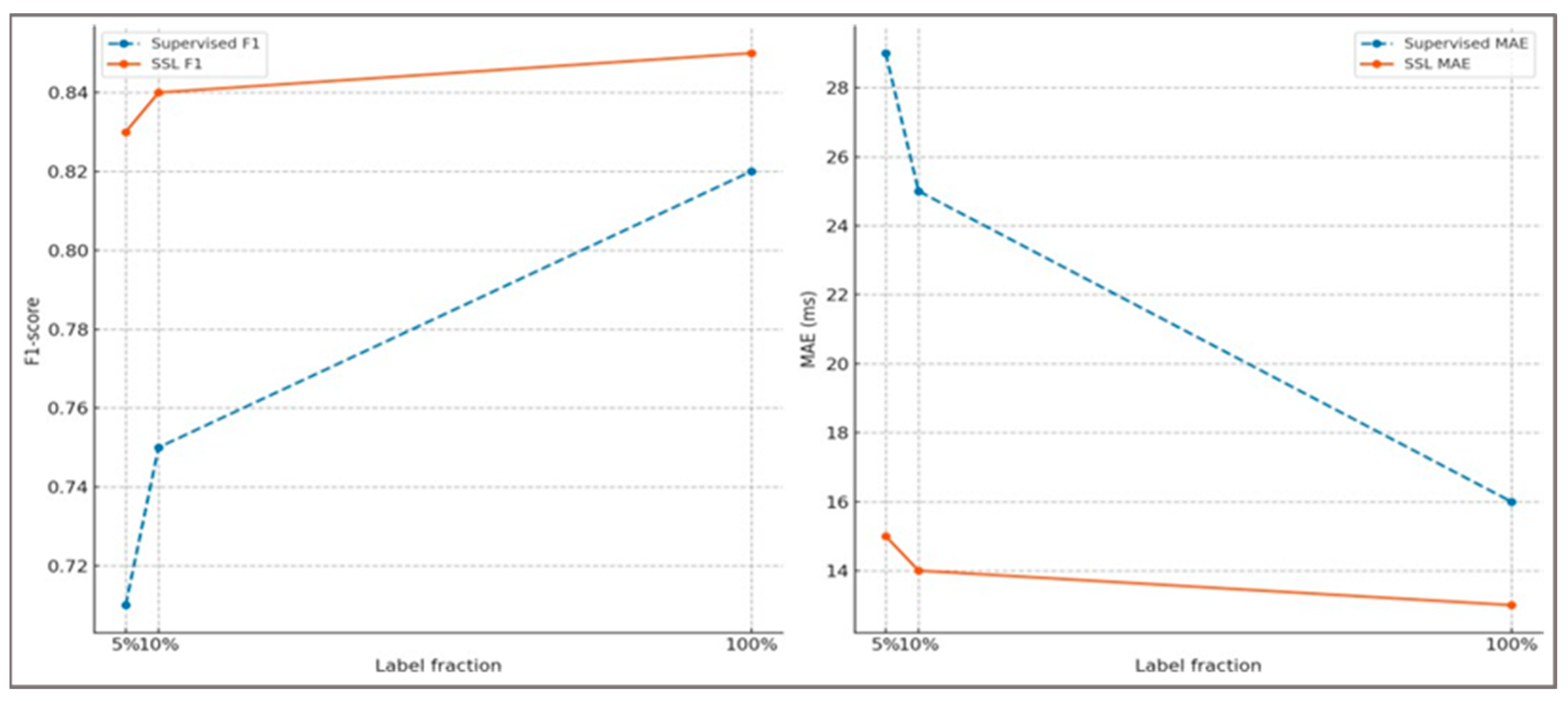Minimal labelled data (≈5–10% of windows) will be sufficient to reach or exceed the performance of fully supervised training, demonstrating label efficiency.