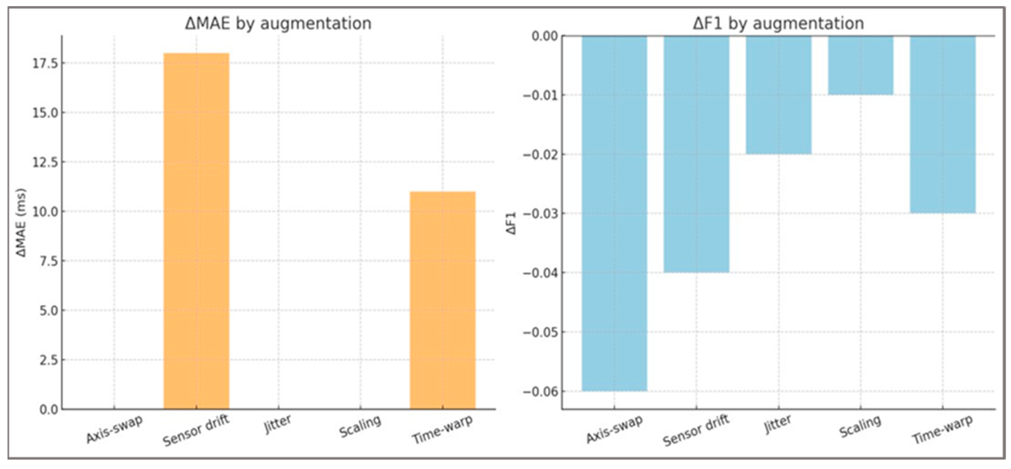 For ablation analyses, each augmentation family was independently disabled and severity levels were systematically varied in order to quantify their contribution to transfer performance. Severity levels for all augmentations were determined empirically through pilot sensitivity analyses to ensure realistic signal variability without distorting gait dynamics.