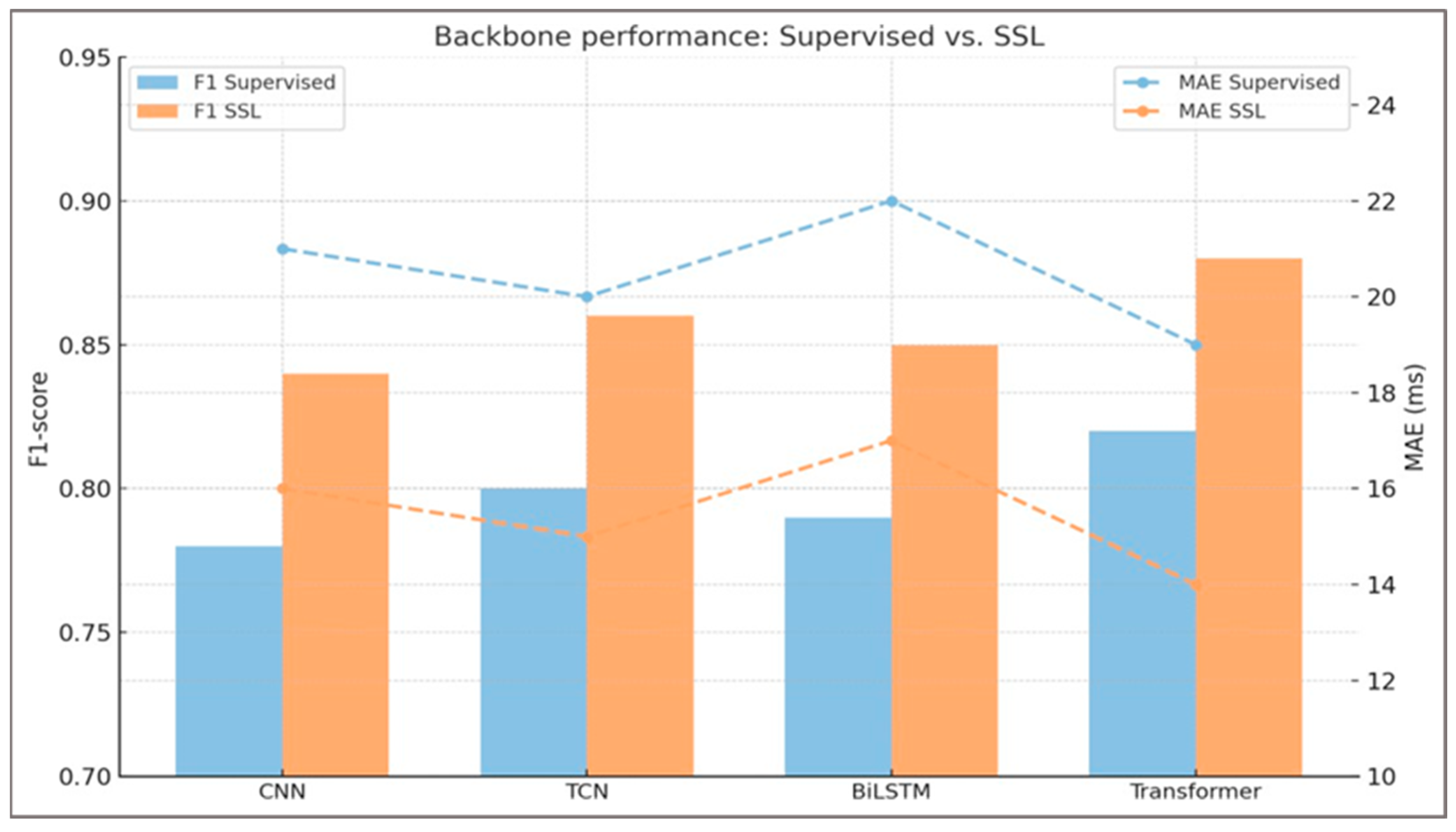 Notes. Baseline corresponds to supervised training from scratch with each backbone. Latency measured on identical GPU batch inference (32 windows). Params indicate trainable parameters in millions. F1, AUROC, and MAE were computed on the held-out test set, with MAE expressed in milliseconds for stride-time estimation. Effect sizes (Cohen’s d) and p-values refer to paired comparisons between SSL and supervised baselines.