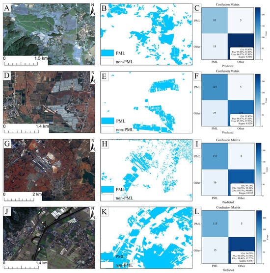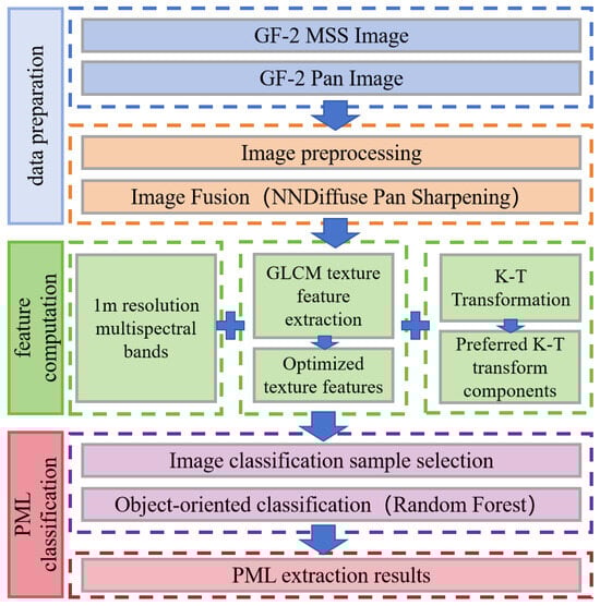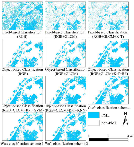 - This study demonstrates that PML can be accurately identified using object-based classification of GF-2 fused imagery, integrating the original spectral bands, optimized texture features, and the second component of the K-T transformation. The method proved transferable across different regions of Yunnan Province, achieving classification accuracies of 93.60% in Luliang County, 93.14% in Zhanyi County, and 94.29% in Shilin District, and 93.43% in Jinghong City, all of which represent relatively high levels of performance. An accuracy assessment carried out in November in the Luliang area achieved 94.29% accuracy, indicating that the method likewise exhibits high temporal stability.