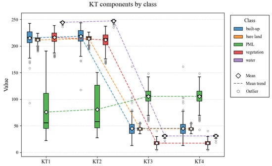 - The second component of the K-T transformation, derived from GF-2 imagery using transformation coefficients from IKONOS data, effectively enhanced the spectral representation of PML and provided clear separability from other land-cover types. Incorporating this component as a classification feature substantially improved the accuracy of PML identification.