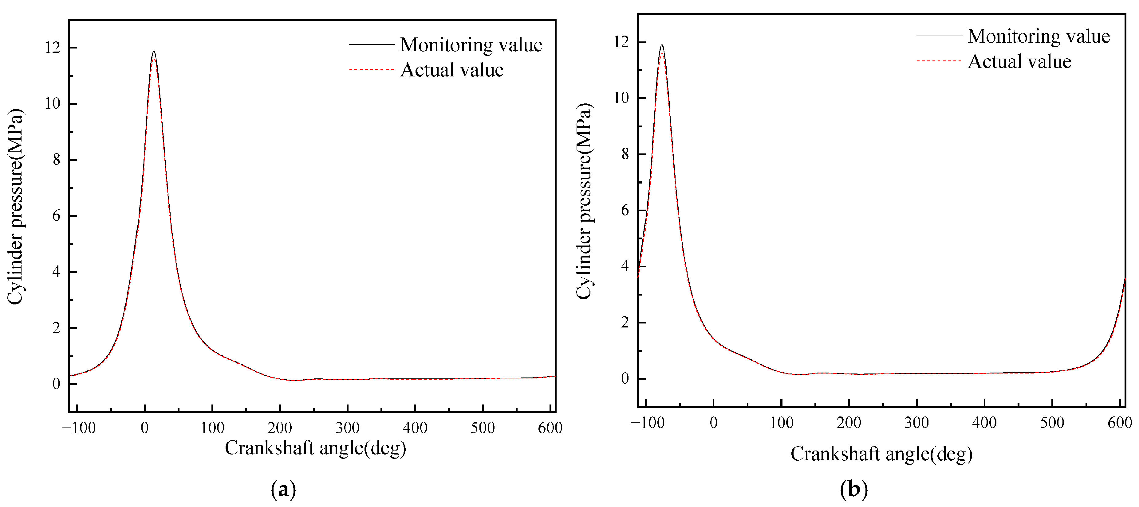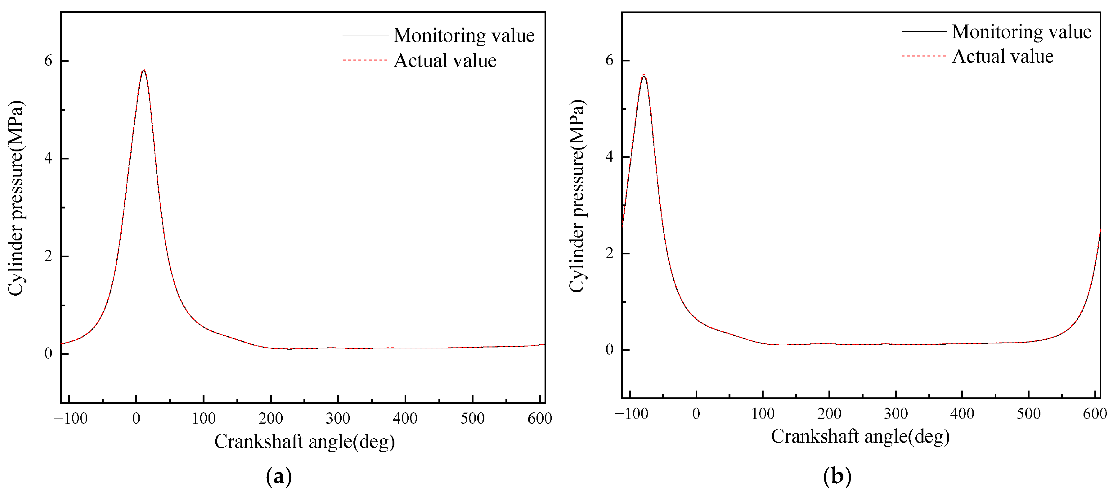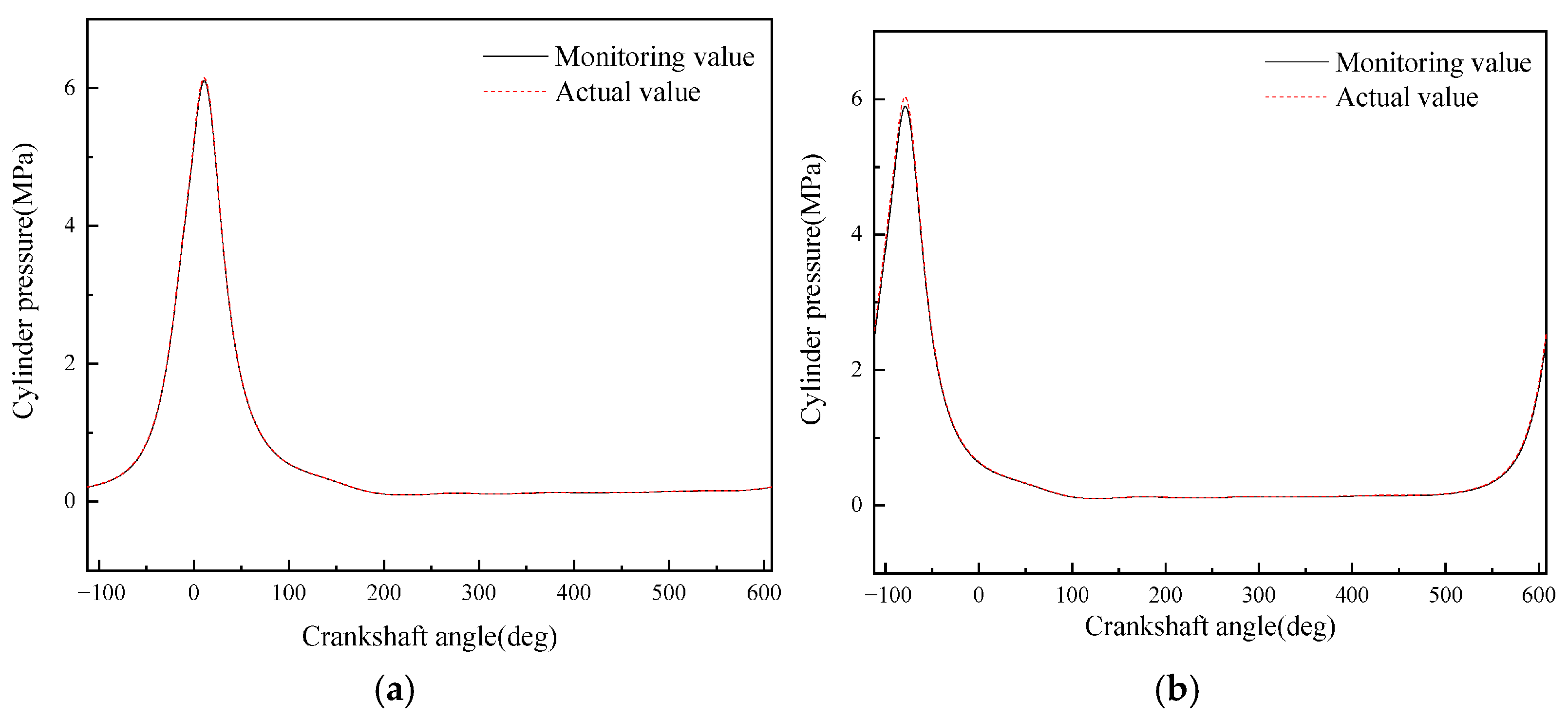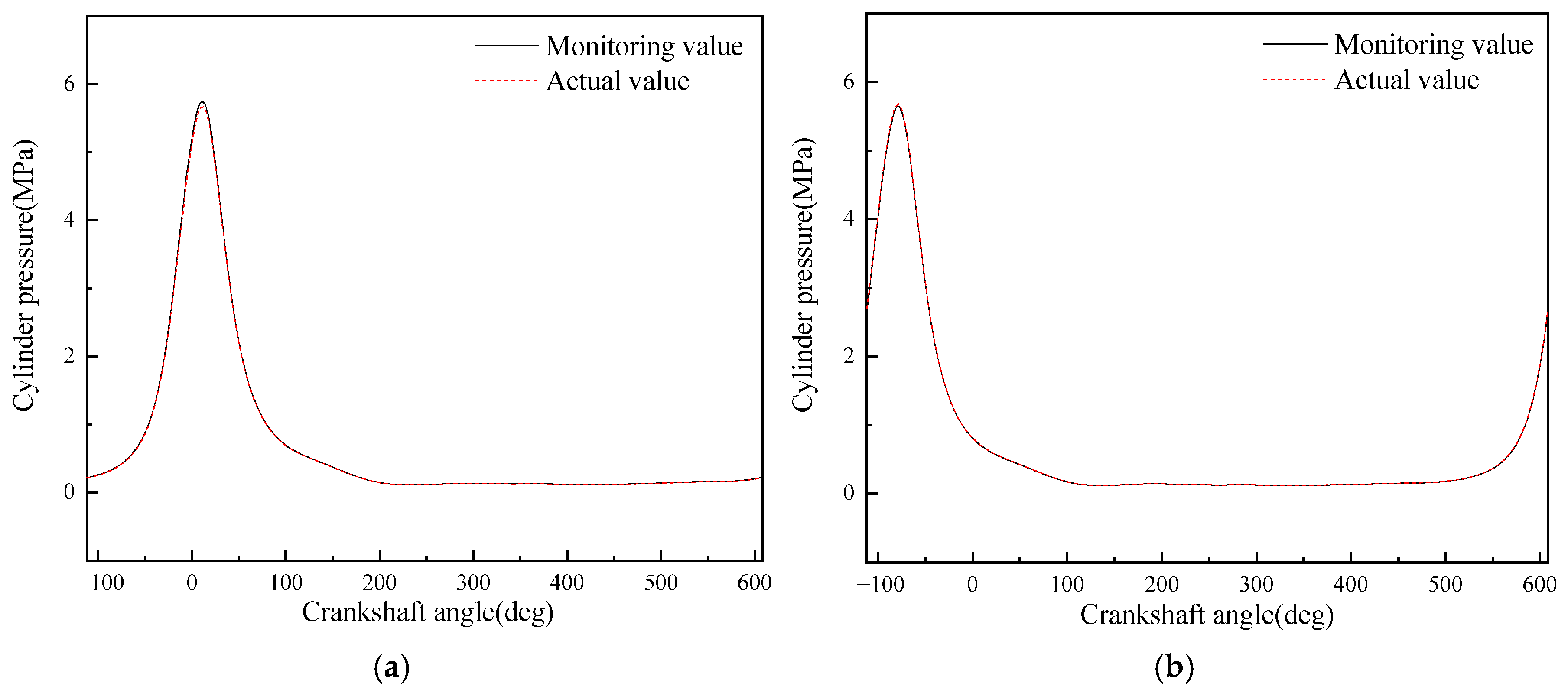 - A diesel engine in-cylinder pressure monitoring model based on GRU is established in this paper. With sufficient training data, the observation accuracy of the in-cylinder pressure curve under different operating conditions is high. After verification under nine operating conditions (three speeds: 1600 rpm, 1800 rpm, 2000 rpm; three loads: 25%, 75%, 100% for each speed), it is found that the average error in the moment when the in-cylinder pressure reaches the maximum value of the monitoring model proposed in this paper is 0 degrees, the maximum difference in the maximum in-cylinder pressure is 0.4826 MPa, and the maximum average in-cylinder pressure error in one working cycle is 8.05%. Moreover, the error is mainly concentrated in the compression process rather than the combustion process. In summary, the in-cylinder pressure monitoring model proposed in this paper has good accuracy.