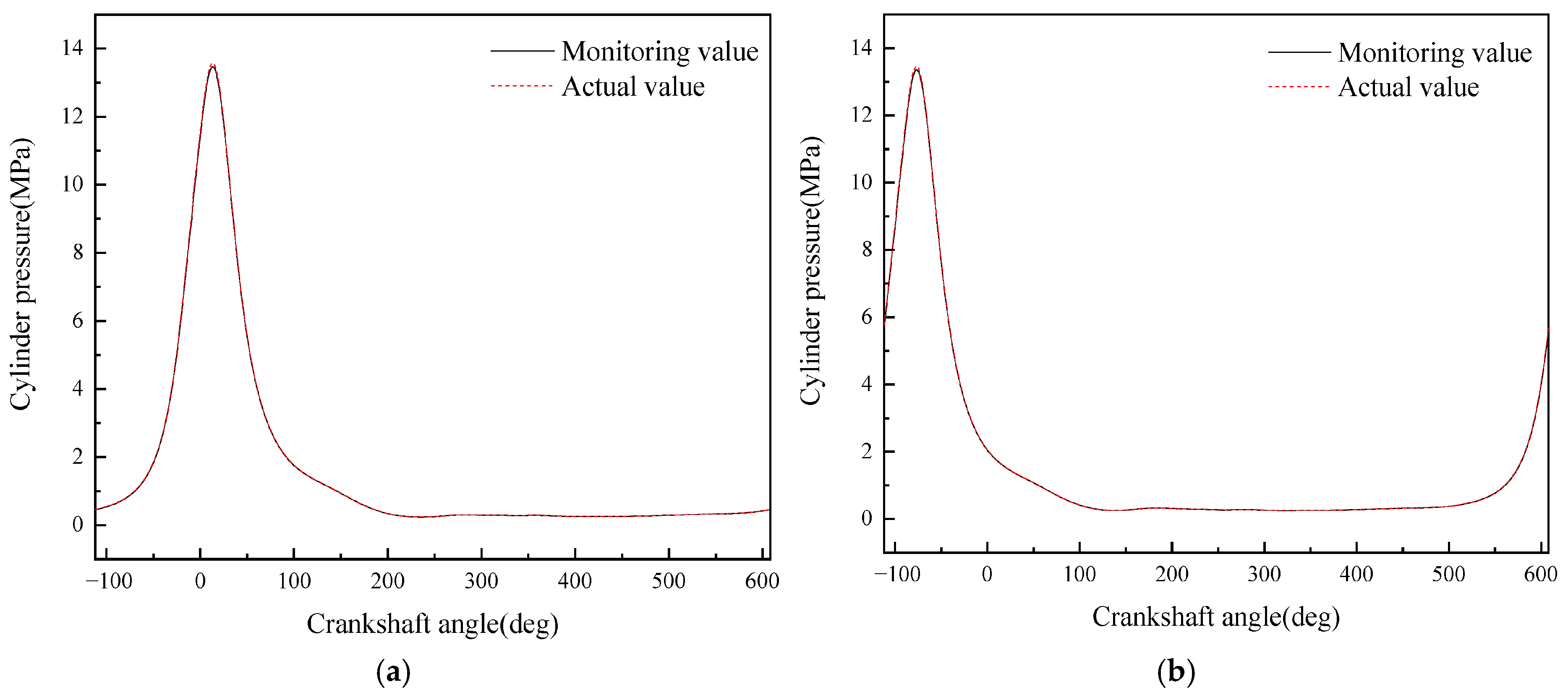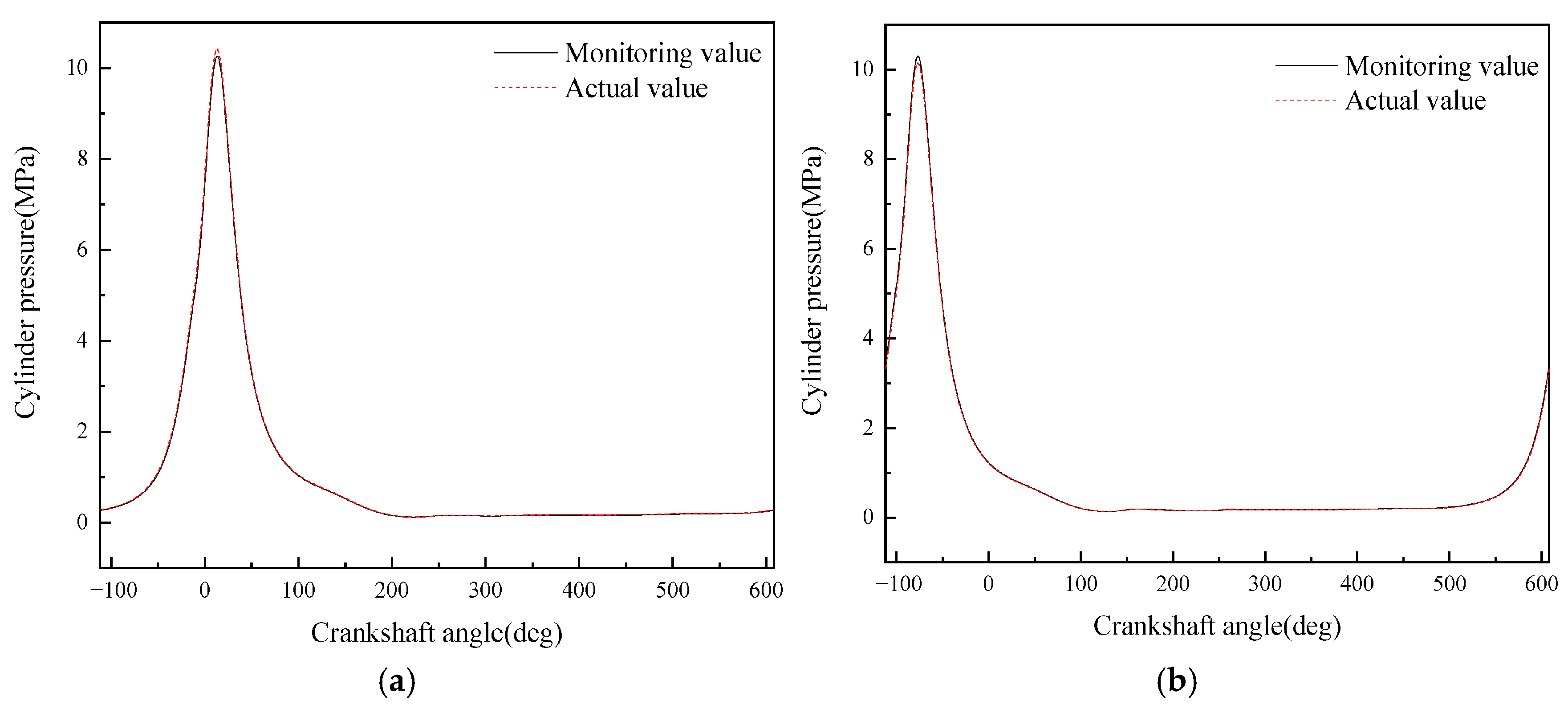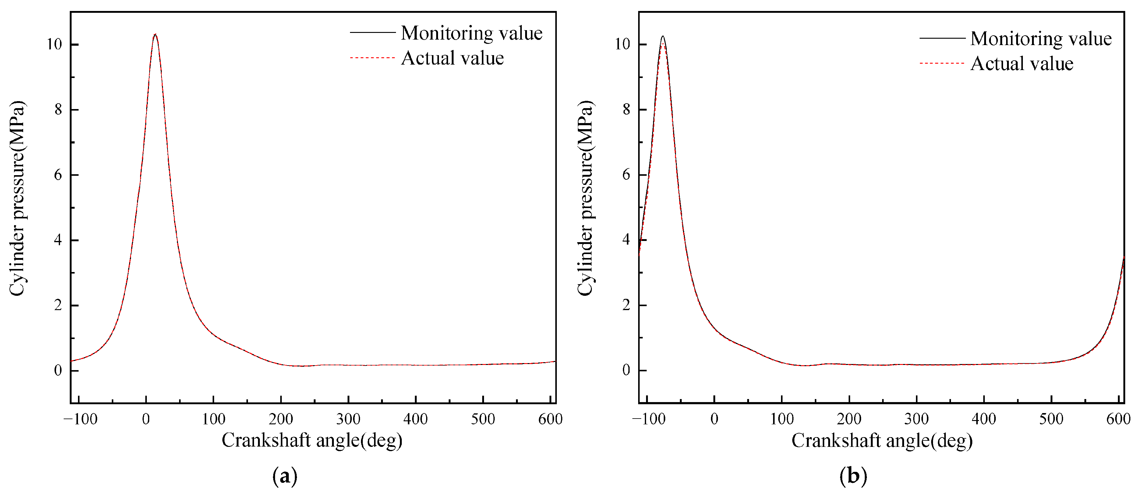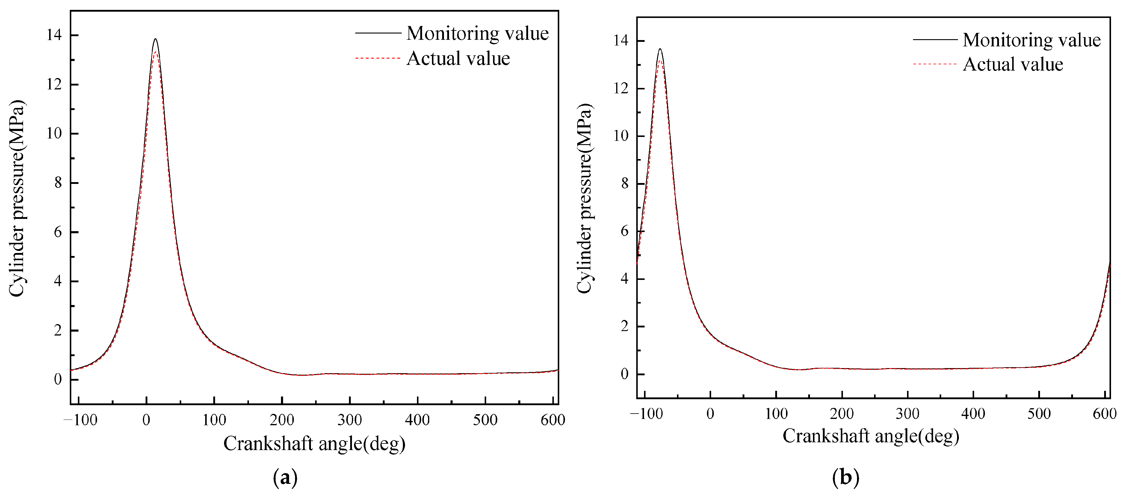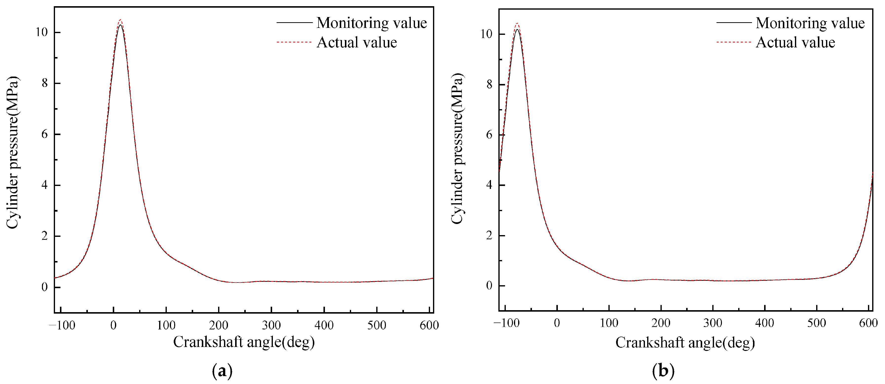 - Although the average in-cylinder pressure error of the monitoring model proposed in this paper increases with the increase in the maximum in-cylinder pressure, the error of the maximum in-cylinder pressure does not change significantly. This is because the error mainly occurs in the range of crankshaft angle from 290° to 340°, i.e., the compression stroke; while when the crankshaft angle is in the range of 360° to 450°, i.e., the power stroke, the error is small.