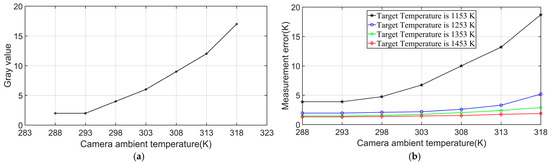 Figure 1a shows the relationship between the average grayscale output generated by the dark current and the camera’s ambient temperature. It can be clearly seen from Figure 1a that the average grayscale output caused by the CMOS dark current increases as the CMOS operating temperature rises, showing an approximately exponential growth trend. Figure 1b presents the comparison results of temperature measurement errors caused by the camera dark current under different measured target temperatures. It can be seen from the figure that the temperature measurement error caused by the dark current increases as both the ambient temperature and the temperature of the measured object rise. Therefore, during the actual on-site temperature measurement process, it is necessary to cool the camera to ensure it operates at an appropriate temperature.